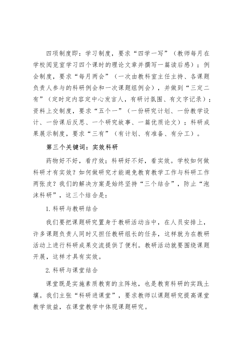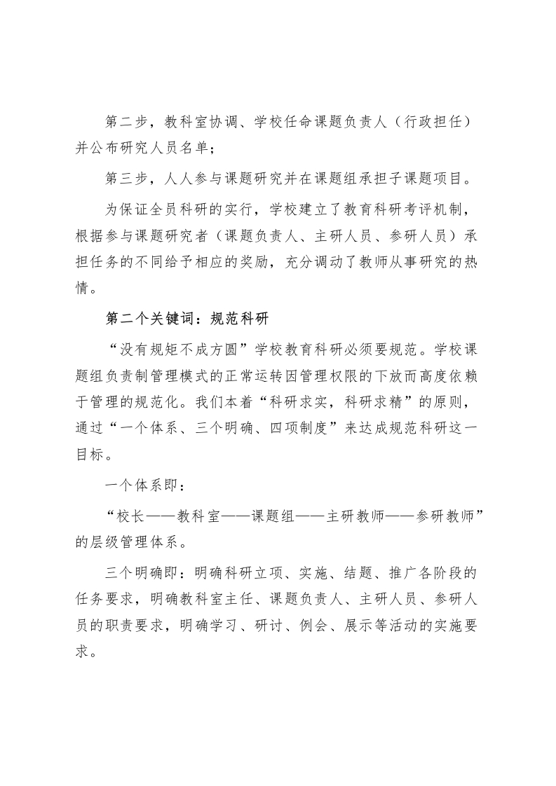 校长在教育科研工作会上,强调了3个关键词,提升学校内涵发展老师们:非常高兴参加今天的教育科研工作会,“我思故我在”,教育科研是思维的盛宴,一所学校的发展,一个教师的成长都离不开教育科研。今天的工作会上我代表学管理团队强调学校教育科研的三个关键词,这三个关键词也是我校教育科研的价值追求和操作方法:第一个关键词:全员科研教育科研是学校内涵发展的牵引力;教育科研是行政持续发展的支撑力;教育科研是教师专业发展的推动力。所以,我校坚持做全员科研,不做少数人做出来的教育科研。基于对教师专业化发展既是个体成长过程,同时也是教师群体发展进程的认识,我校始终坚持全员参与教育科研的思路。即:以任务分的形式展开运作,由课题组长牵头负责、课题成员分工协作,专家介入,各司其职、各负其责,分三步调动全员参与,做到人人有课题:第一步,教科室向教师发放课题申报表,教师自主选报课题并申请担任课题负责人或主、参研人员;
