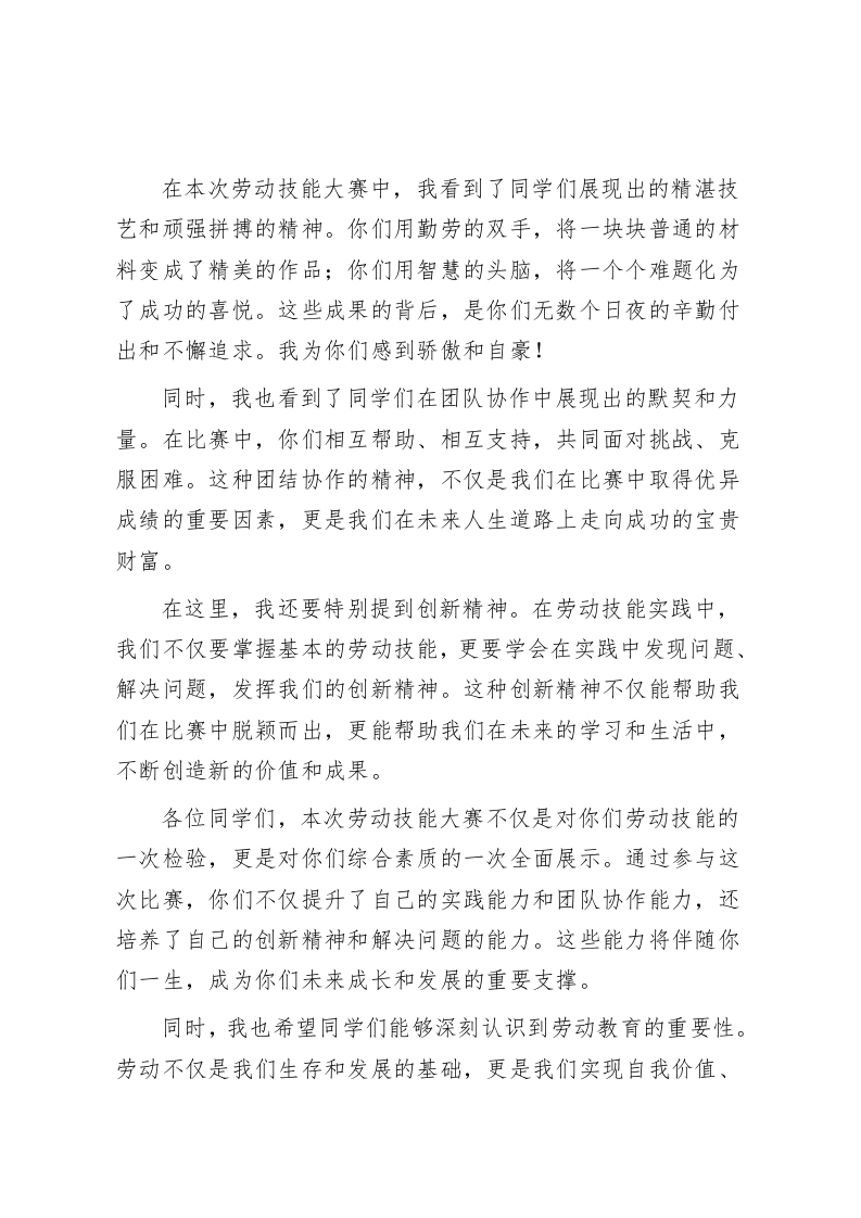 校长在劳动技能大赛上讲话劳动,是人类文明进步的阶梯,是创造美好生活的源泉尊敬的各位老师、亲爱的同学们:大家上午好!在这个阳光明媚、充满活力的日子里,我们齐聚一堂,共同见证和参与这场盛大的全校学生劳动技能大赛。首先,我代表学校向所有参赛的同学表示热烈的祝贺,向辛勤付出的老师们表示衷心的感谢!劳动,是人类文明进步的阶梯,是创造美好生活的源泉。我们身处一个快速发展的时代,科技的进步让我们的生活变得更加便捷,但劳动的价值和意义却从未改变。劳动技能,不仅是我们生存和发展的基础,更是我们实现自我价值、贡献社会的重要途径。因此,本次劳动技能大赛的举办,不仅是对同学们劳动技能的一次检阅,更是对同学们实践能力、团队协作能力和创新精神的一次全面锻炼。回顾我们学校的历史,一直以来,我们坚持把劳动教育作为学校教育的重要组成部分。我们鼓励同学们走出课堂,走进实践,通过亲身参与劳动,感受劳动的艰辛与快乐,培养同学们的劳动意识和劳动习惯。如今,这种劳动教育的理念已经深入人心,成为了我们学校文化的重要组成部分。