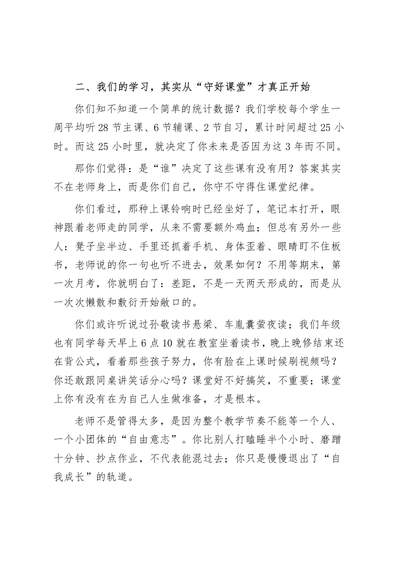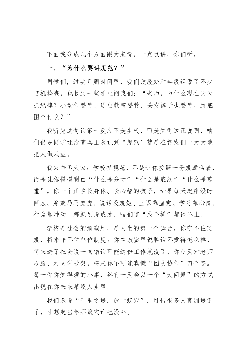 以规范为本,以纪律为荣一一校长在学生行为养成教育大会上的讲话亲爱的同学们:大家上午好。今天我们聚在操场上这个会议,是一次简单却很重要的教育交流,不讲考试成绩,也不拼升学数据,更不炫耀什么成果。我今天只想和大家坐下来,聊一聊“人应当怎样成长”,聊一聊“怎么把自己管住”,聊一聊“我们这个学校该是什么样”,这些简单却又常常被忽视的大问题。你们当中很多人,正处在人生中最关键的一段旅程。这段路,不光是学习的路,更是形成习惯、磨炼性格、长出骨气的路。如果把人生比作一棵大树,那今天我们要说的话,就是这棵树的根。你扎不扎得下去、能不能稳起身,就是看你有没有这几样东西:规矩、纪律、自觉,还有一点责任感,懂得“哪里该停、什么时候该走”。所以今天,我讲的话主题就两个字:“守住”。我们先不谈理想、不谈成功、不讲未来五年去哪读大学,咱们从这些“明天要迟到怎么办”“吃饭排队行不行”“别人讲课我能不能低头玩手机”这样的小事说起。你守不住生活中的小场景,将来是守不住人生的大局的。