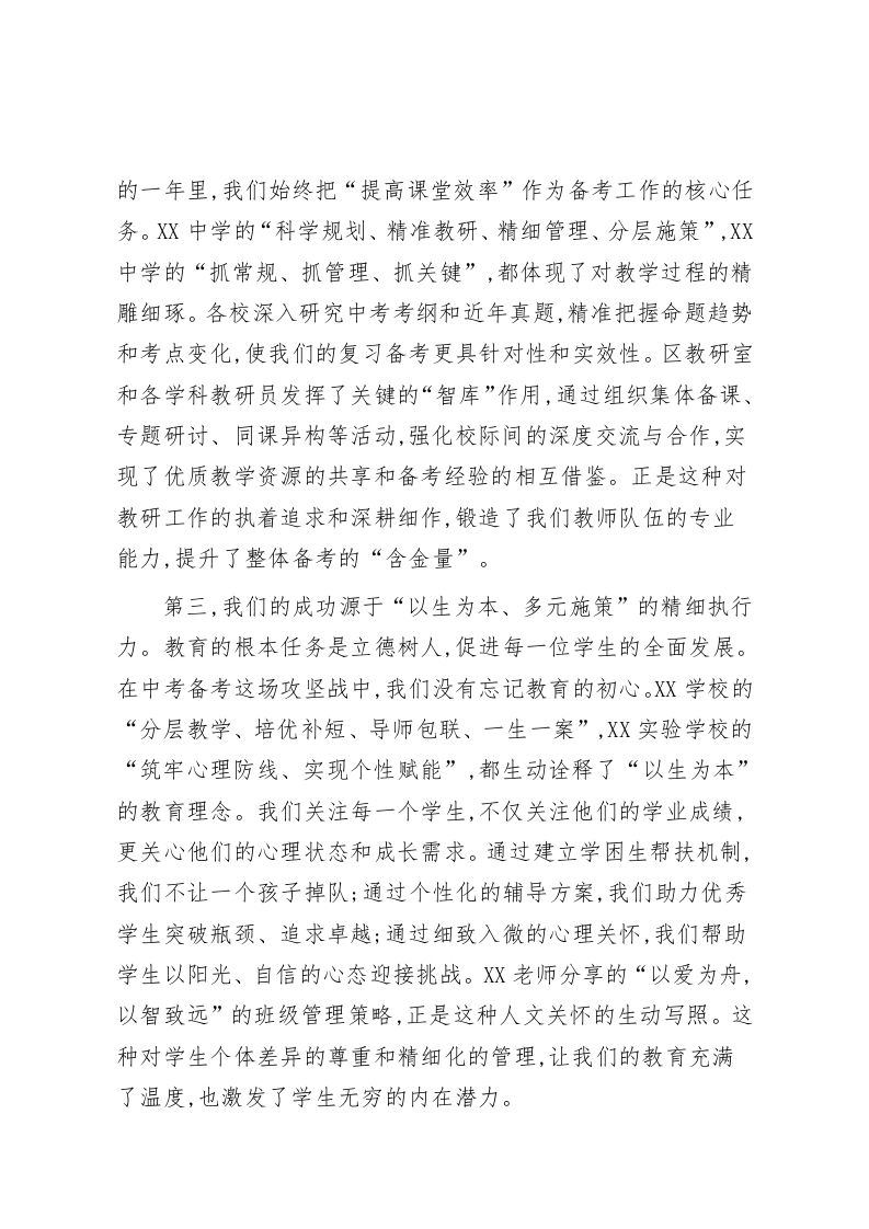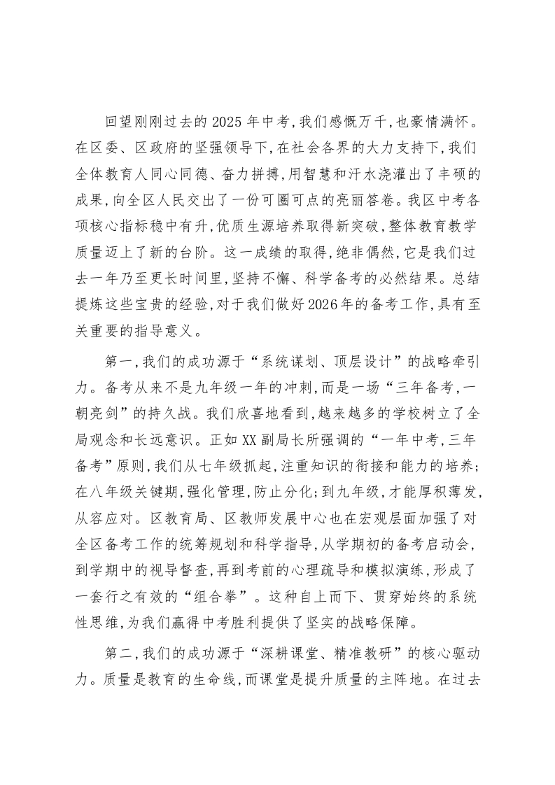 在XX区2025年中考总结暨2026年中考备考座谈会上的讲话(精品)同志们、老师们:大家下午好。今天,我们怀着回顾过去、擘画未来的心情,在这里隆重召开XX区2025年中考总结暨2026年中考备考座谈会。刚才,我们认真听取了X中学、XX中学、XX学校、XX实验学校等四所学校的备考经验分享,也学习了XX老师和XX老师作为优秀班主任和学科教师代表的一线智慧,XX老师代表区教师发展中心对2025届备考工作作了系统回顾,XX副局长和XX副局长也分别从不同角度对我们的工作提出了深刻见解和具体要求。大家的发言,内容翔实、思路清晰、措施有力,既有对过去成功经验的深刻提炼,也有对未来备考工作的冷静思考和科学谋划,我深受启发,也倍感振奋。借此机会,我代表区教育局,向在2025年中考中取得优异成绩的各个学校表示热烈的祝贺!向为我区教育事业辛勤耕耘、无私奉献的全区广大教育工作者,特别是奋战在毕业班一线的全体教师和管理干部,致以最崇高的敬意和最诚挚的感谢!一、肯定成绩,总结经验,在回顾与反思中坚定高质量发展的信心