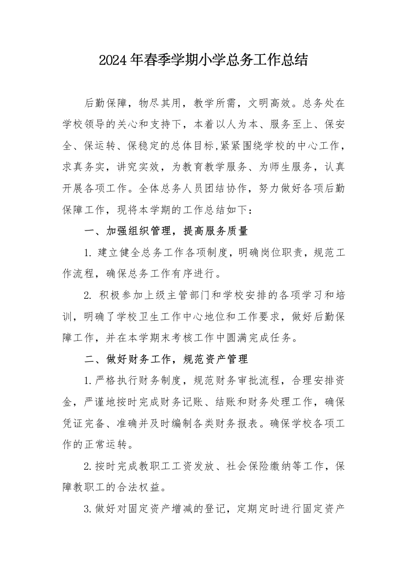 2024年春季学期小学总务工作总结后勤保障,物尽其用,教学所需,文明高效。总务处在学校领导的关心和支持下,本着以人为本、服务至上、保安全、保运转、保稳定的总体目标,紧紧围绕学校的中心工作,求真务实,讲究实效,为教育教学服务、为师生服务,认真开展各项工作。全体总务人员团结协作,努力做好各项后勤保障工作,现将本学期的工作总结如下:一、加强组织管理,提高服务质量1.建立健全总务工作各项制度,明确岗位职责,规范工作流程,确保总务工作有序进行。2.积极参加上级主管部门和学校安排的各项学习和培训,明确了学校卫生工作中心地位和工作要求,做好后勤保障工作,并在本学期末考核工作中圆满完成任务。二、做好财务工作,规范资产管理1.严格执行财务制度,规范财务审批流程,合理安排资金,严谨地按时完成财务记账、结账和财务处理工作,确保凭证完备、准确并及时编制各类财务报表。确保学校各项工作的正常运转。2.按时完成教职工工资发放、社会保险缴纳等工作,保障教职工的合法权益。3.做好对固定资产增减的登记,定期定时进行固定资产