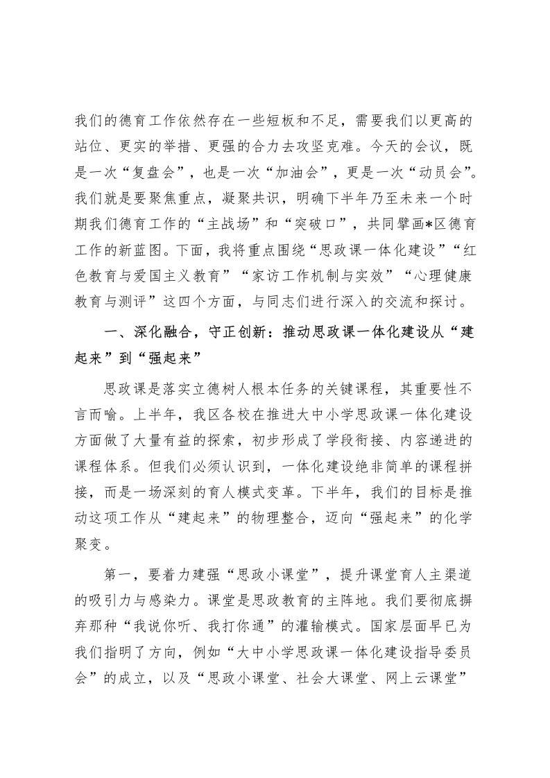 在全区2025年下半年中小学德育工作推进会议上的讲话尊敬的各位校长、各位老师,亲爱的家长代表、社区工作者朋友们,同志们:大家下午好!金秋十月,丹桂飘香。我们怀着对教育事业的赤诚之心和对下一代成长的深切关怀,齐聚一堂,召开*区2025年下半年中小学德育工作推进会议。首先,我谨代表区教育局,向长期以来辛勤耕耘在德育工作第一线、为孩子们的健康成长默默奉献的全体教育同仁,向给予我们无限信任与支持的各位家长朋友,以及与我们携手共育、共建和谐社区的各位社区工作者们,表示最崇高的敬意和最诚挚的感谢!今天我们会议的主题,是回顾与展望,是总结与部署。2025年已经走过了大半,回首上半年,在区委、区政府的坚强领导下,在全体德育工作者的共同努力下,我区的德育工作稳步推进,亮点纷呈,取得了可喜的成绩。我们欣喜地看到,全区中小学的德育工作体系愈发完善,育人渠道不断拓宽,德育实效持续增强,为学生的全面发展和健康成长奠定了坚实的基础。但是,我们也要清醒地认识到,立德树人是一项系统工程,是一场永不停歇的“长跑”。面对新时代、新形势、新挑战,