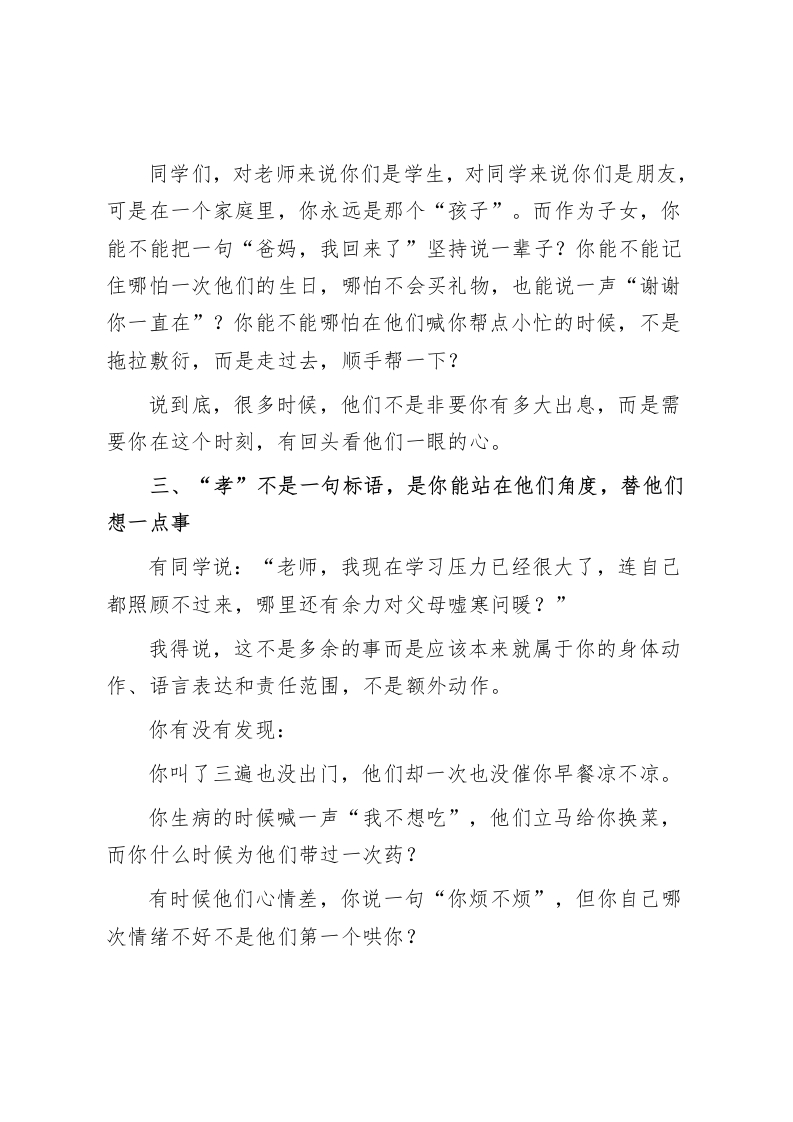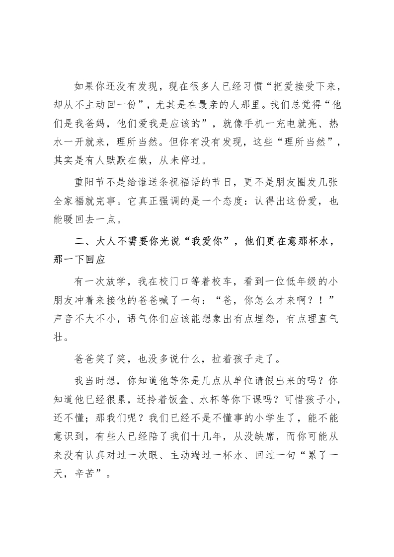 重阳节·敬老情|校长在国旗下讲话:孝亲,是根,是爱,更是我们一生的必修课尊敬的老师、亲爱的同学们:大家早上好!今天我站在这儿,说的是一件不新鲜,但却无法忽略的事。我们今天开这次晨会,不是讲成绩、不谈考试,也不动员某个竞赛进度,就只想静一静,说一件“看似老掉牙、其实一直放不下”的事。今天的讲话主题,叫《孝亲敬老,让温暖从今天开始》。一、讲讲这一天重阳节,其实不是给高龄老人的专属安排大家都知道今天是什么日子吧?农历九月初九,也就是我们中华民族的传统节日“重阳节”。说起来,这个节日不如春节热闹、不如中秋诗意、不如清明沉重,但是别小看它,它有一种特别的气质,朴素、沉静、又带着一点不言说的深情。很多同学可能会以为:这不过是又一个节日,不放假也没什么特别的安排。其实不然。重阳节最早是古人用来祭祖、登高、敬老的。后来国家定了个名,叫“老年节”,明确了这个节日身上那句最动人的字眼:敬老。可是哪怕你现在年纪小,不当爷爷奶奶,也早就在这个话题里了。怎么讲?
