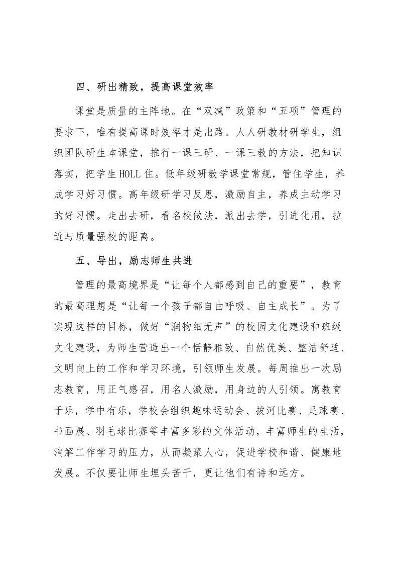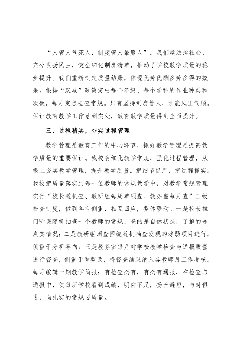抓教学质量,副校长交流发言把简单的事情做好,把细小的事情做亮各位老师:质量是立校之本,是老师的身价。我校不断强化精细化教学管理,重细节、重过程、重落实、重质量、重效果,在每一个细节上精益求精,把简单的事情做好,把细小的事情做亮,做到人司其职、人尽其力、人负其责、物尽其用的良好效果,让教育教学质量大幅度提升。一、目标精准,引发内驱力目标是方向,目标是动力。我校不断强化目标管理,建立目标导向机制,聚师生发展共识。我们抽考和调考力争前八名,义教评估进入获奖行列。我们把这一目标分解到,到教师,到学生,层层签订教学质量目标责任书,每个班每个人制定各次考试目标,每位老师要按三率一分定好学生,以目标激励行动,用行动成就目标,做到人人有压力,个个有动力,激励师生不断追求新的成就。二、制度精细,遵循管理尺子