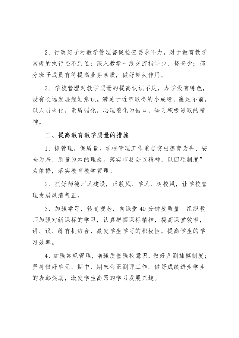 抓教学质量,中心小学校长发言学校管理发展任重道远各位领导,各位老师:一、基本情况2025一2026学年,全镇共有校点6所,其中完小两所,学生共计1234人。其中,学前班60人,一年级239人,二年级189人,三年级220人,四年级181人,五年级164人,六年级181人。2025一2026学年,xx镇小学六年级在全市统测中,教学质量取得一定的成绩,语文、数学两个科目获得县级第二名,科学科目获县级第五名,三科综合为县级第三名。虽然六年级成绩在前列水平,但是其他年级在全县质量检测中处于中间水平,个别科目甚至处于后位,与我们的期望差距较大。目前学校总体的发展不尽人意,对于抓管理,促质量工作非常紧迫,发展存在很大的隐患。二、原因分析1、没有引领好我校教师认清当前的形势,提高政治思想素质、转变工作作风,勤研、善教,乐教。