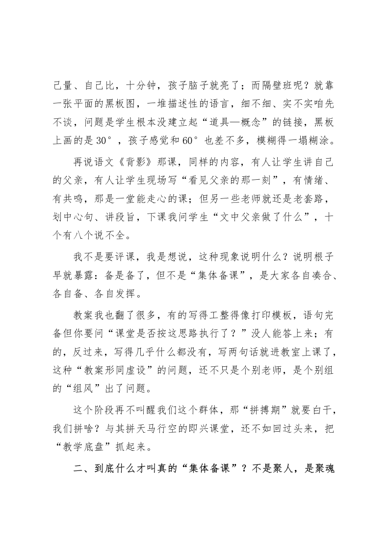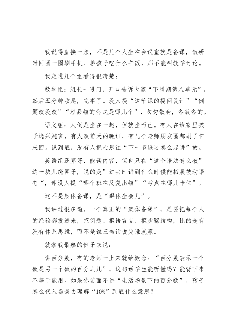 抓实集备“读、思、写、议、改、用”,让课堂真正提质增效一一校长在教师大会上的讲话各位老师:今天把大家叫过来,不是图个流程,也不是又一次走马灯式的“教研例会”,而是我这些天看了太多问题、翻了太多教案,听了二十多节课之后,觉得不说不行、不说清楚我们教学的路子要走偏。开门见山,我今天这场交流只有一个核心:把集体备课这件事“钉”下来,把它彻底做实做深。说实话,也不怕让大家觉得难听,连着两个月,我在不同学科、不同年级的课堂里,看见了太多“各自为政”的影子。咱们不能再假装看不到,也绝不能再“自说自教”,再下去,只会被学情拖着走、被高压教学架着跑。一、我为啥要专门开这个会?不是为了鼓励,是为了叫醒前两个多月,我去了大概二十几节课,很多人课前都很认真准备,我不否认。但你准备得是不是高效的、是不是站在学生学习规律出发的,是另一码事。就拿数学课来说,讲“角的度量”这节,有的老师拿出三角板、量角器,现场演示、实物操作,讲得明明白白,学生自