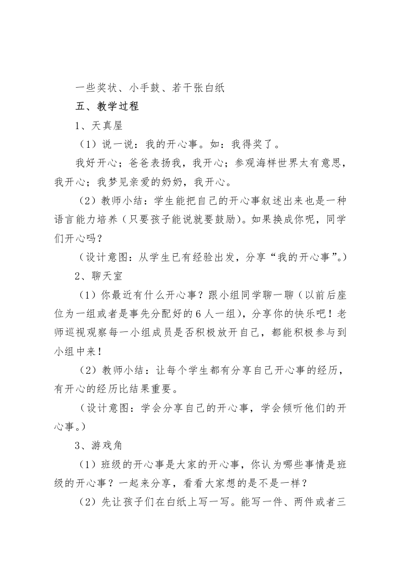 二年级心理健康教案:学会合作一、设计背景二年级的孩子,是自信心形成的关键时期。很在乎别人对他的评价,特别是当受到老师表扬、奖励、鼓励的时候,产生兴奋感(座位不够他坐的时候,高兴得手舞足蹈),自豪感自信心会大增,所以二年级的孩子,自我控制能力较弱,情绪不稳定,容易激动、冲动,上课专注力好于一年级,但是容易被外界吸引,爱表现是二年级孩子的一大特点,即使是撒谎也是为了表现自己,很想引起老师的关注。二、教学目标1、通过说一说、玩一玩、写一写等活动,认识到在生活中要做开心的自己。2、通过游戏活动,孩子学会接纳自己,学会分享开心,培养孩子们分享描述自己开心事件的能力以及培养孩子们的积极的审美能力。3、引导学生明白怎样做会获得开心快乐,进而树立为他人服务而开心的思想,为健康快乐的人格打下良好的基础。三、教学重难点教学重点:让学生认识到在生活中要做开心的自己。教学难点:引导学生明白自己怎么做会获得开心快乐,以及指导自己怎样做会让他人获得开心快乐!四、教学准备