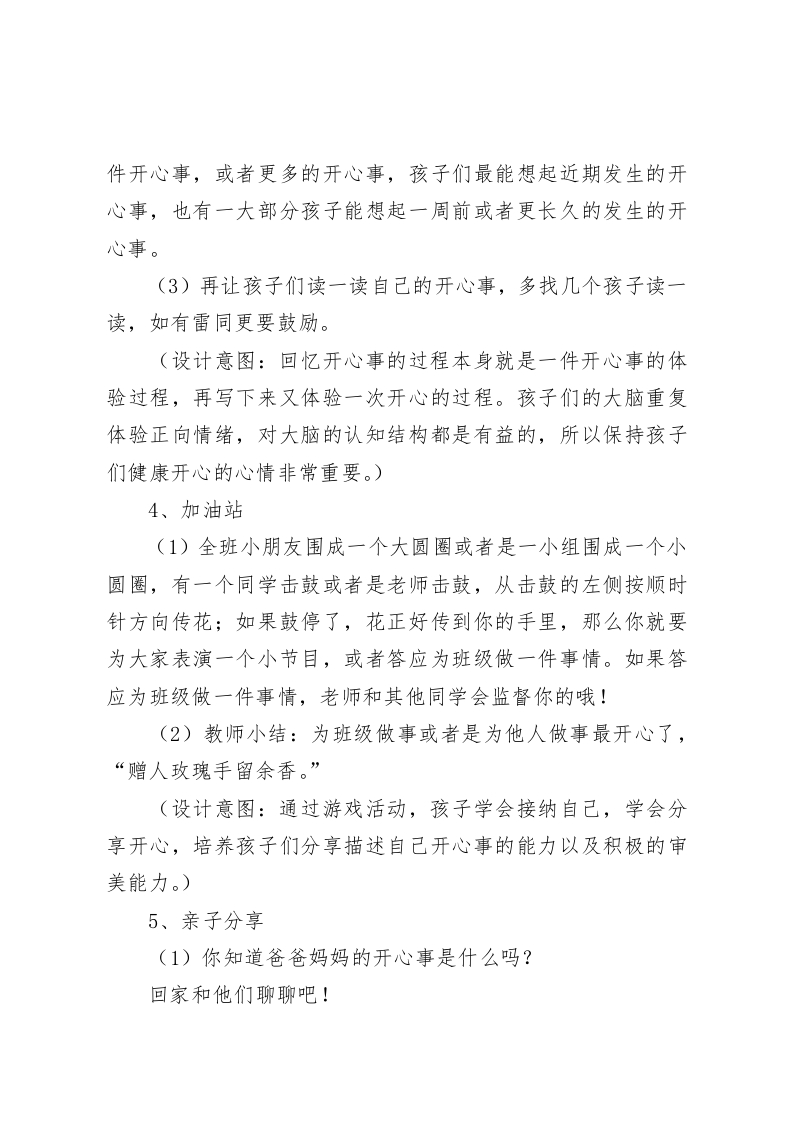 二年级心理健康教案:做开心的自己一、设计背景二年级的孩子,是自信心形成的关键时期。很在乎别人对他的评价,特别是当受到老师表扬、奖励、鼓励的时候,产生兴奋感(座位不够他坐的时候,高兴得手舞足蹈),自豪感自信心会大增,所以二年级的孩子,自我控制能力较弱,情绪不稳定,容易激动、冲动,上课专注力好于一年级,但是容易被外界吸引,爱表现是二年级孩子的一大特点,即使是撒谎也是为了表现自己,很想引起老师的关注。二、教学目标1、通过说一说、玩一玩、写一写等活动,认识到在生活中要做开心的自己。2、通过游戏活动,孩子学会接纳自己,学会分享开心,培养孩子们分享描述自己开心事件的能力以及培养孩子们的积极的审美能力。3、引导学生明白怎样做会获得开心快乐,进而树立为他人服务而开心的思想,为健康快乐的人格打下良好的基础。三、教学重难点教学重点:让学生认识到在生活中要做开心的自己。教学难点:引导学生明白自己怎么做会获得开心快乐,以及指导自己怎样做会让他人获得开心快乐!四、教学准备