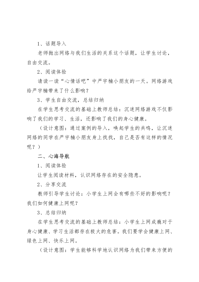 六年级心理健康教案:健康上网快乐多设计背景:小学六年级是学生意志品质形成的关键时期,也是人格发展的重要时期,他们接触网络的时间越来越长,对网络也越来越迷恋。其中相当一部分学生盲目追求个人兴趣,缺乏自我控制能力,浪费大量宝贵的时间,以致荒废了学业,催生了许多身心问题。为了不使他们在网络中“迷失”,作为师长的我们不仅要“教”,更要“导”,以发挥网络积极的一面,为孩子们的正确上网保驾护航。教学目标:1、认识网络的利弊,懂得有计划、有节制上网的重要性。2、掌握正确上网的方法,学会健康上网、绿色上网、快乐上网。3、增强学生的文明上网意识,体验健康上网的乐趣。教学重点:让学生认识到网络是一把双刃剑,它既可以帮助我们学习、娱乐,也会让我们沉迷其中而误入歧途,影响我们的身心健康。教学难点:教给学生正确上网的方法,提高自己的辨识能力、控制能力,学会健康上网、绿色上网、快乐上网。教学准备:一、心情话吧