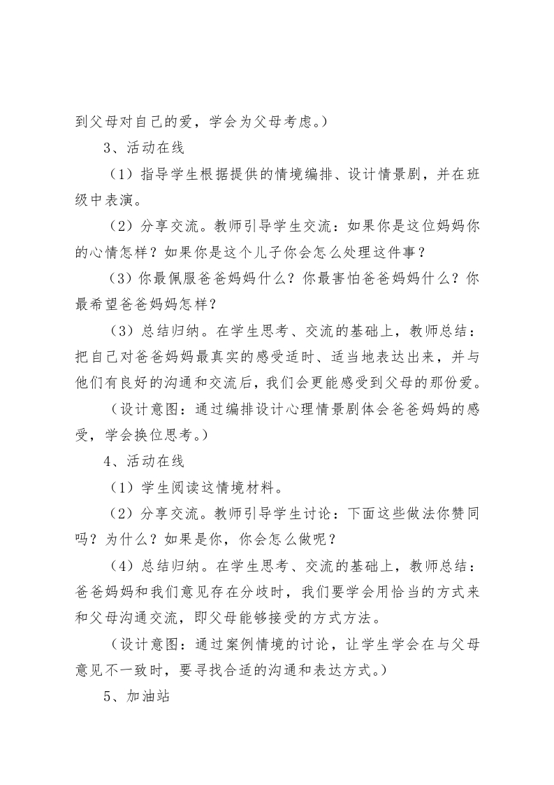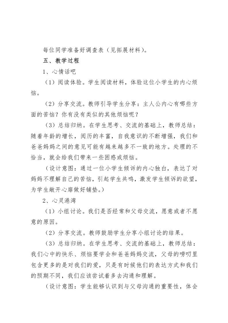 六年级心理健康教案:妈妈请您听我说一、设计背景小学五、六年级开始进入青春期。青春期的孩子正处在未成年人向成年人的过渡时期,这个阶段人的心理发育处在活跃状态。随着知识的积累和对社会了解的进一步加深,主观意识不断增强,以往的生活方式在不断地调整,这个时期的孩子就会产生逆反情绪。随着他们对于社会、家庭、学习、生活的参与度的不断提高,他们的思维也随之而不断改变。由于他们的经验和能力具有一定的缺失性,行为和思维具有一定的盲目性,对于事物的认知和理解缺乏深度和广度,他们的心理还不够成熟,事实和思维之间的差距会对他们的心理造成一定的影响,他们对于事物的认知会常处于纠结与困惑之中。他们为了能够不断地适应各种需求,不断地修正自己的思维和对现实社会的认识,所以,这个青春期的孩子烦恼就会油然而生。二、教学目标1.协助学生了解亲子冲突的原因。2.理解父母,学会化解与父母的矛盾和冲突。3.学生体会到父母对自己的爱,激发学生对父母的爱和感恩、体贴父母的情感。三、教学重难点教学重难点:理解父母,学会化解与父母的矛盾和冲突。四、教学准备