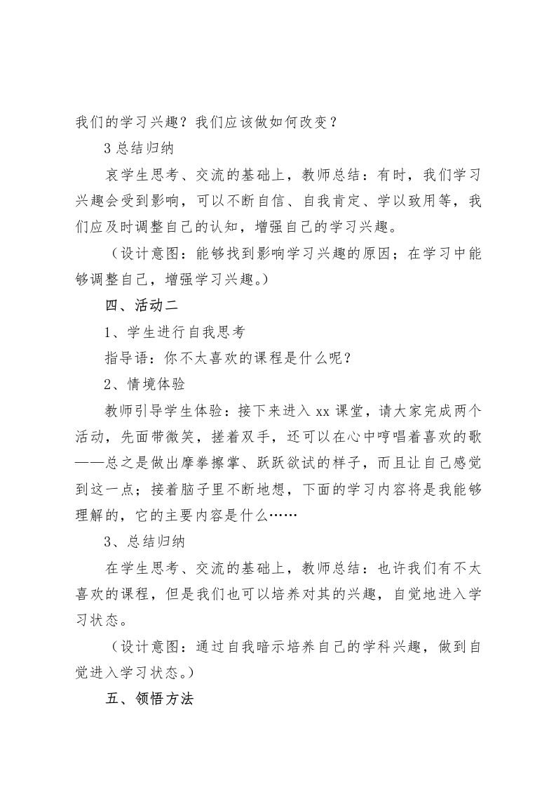 六年级心理健康教案:兴趣为学习导航设计背景:学习对于学生的感受和认识,将直接影响到学生的兴趣、求知欲和进取精神,也影响学生未来的发展。许多学生在尚未真正了解知识的魅力之前,就因各种各样的愿意得到了一些对学习的负面感受,从而大大降低了学习的兴趣。学生中有这样一个现象,一年级的小学生对学校很喜欢,对学习有兴趣,但随着年级的升高,对学习的兴趣在减退。教学目标:1、帮助学生了解自己的学习状态,激发学生的热情。2、引导学生自我剖析产生厌学情绪的原因、培养学习兴趣。3、对学生产生浓厚的兴趣,在兴趣中学习进取。教学重点:培养学习兴趣。教学难点:培养学习兴趣。教学准备:每位同学准备好记号笔和卡片。教学过程:一、案例导学1、阅读体验让学生阅读材料,了解娇娇的兴趣爱好。2、分享交流教师引导学生分享:娇娇的兴趣是什么?娇娇头脑灵活,