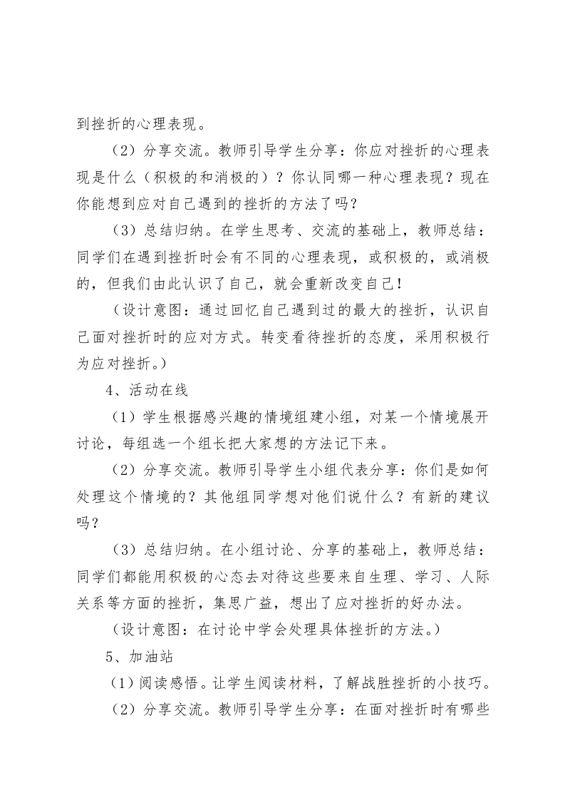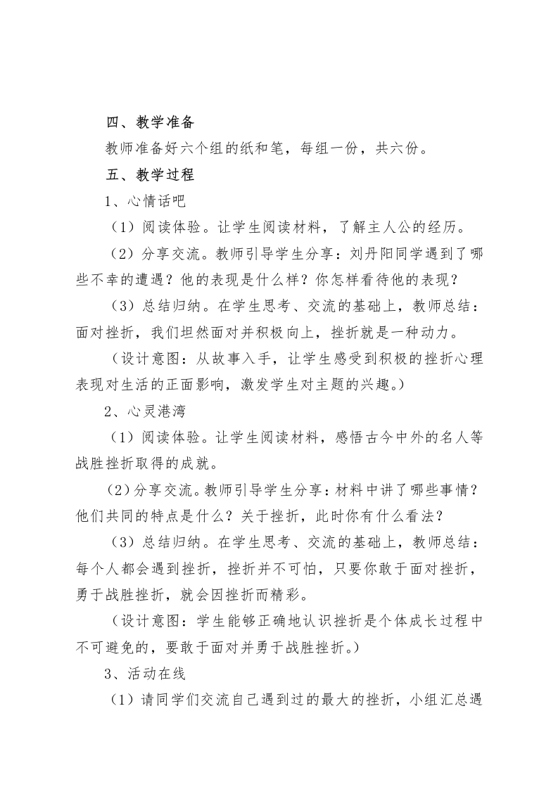 六年级心理健康教案:在生活中成长一、设计背景所谓挫折承受力,是指个体遭受挫折后,能够适应、抗御和对付挫折的一种能力。挫折承受力强的人不仅能经受起挫折的打击和压力,较少有强烈情绪的困扰,而且能积极地改善挫折情境。挫折承受力弱的人对挫折过分敏感,即使受到轻微的打击,也感到难以忍受,并容易长期为不良情绪所困扰,乃至出现心理和行为失常。挫折承受力是一个比较复杂的问题,它经常随具体的个人和情境条件的不同而变化,受许多因素的影响。学生必须在日常的学习生活中经受磨炼,保持坚强的意志,明知山有虎,偏向虎山行。理性地对待周围的一切事物,努力提高自身的挫折承受力,做人格健全的人。二、教学目标(1)能正确看待挫折,认识到挫折是个体成长过程中不可避免的。(2)学会寻找、应对挫折的技巧与方法。(3)激发学生战胜挫折的勇气和信心,提高抗挫能力。三、教学重难点教学重点:正确看待挫折,直面挫折。教学难点:激发学生战胜挫折的勇气和信心,提高抗挫能力。