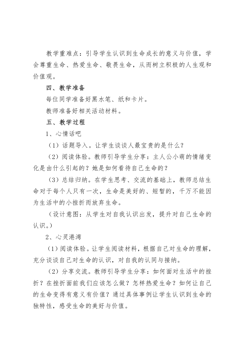 六年级心理健康教案:珍爱自己一、设计背景小学六年级学生已经开始进入青春期,这个阶段的孩子身心发展的速度都在加快,身心的变化让他们有了从来没有的渴望、好奇、迷茫、甚至是害怕,他们的情绪也容易受到外界事情的干扰,遇到困难容易退缩、消极。情感意志薄弱和内心要求独立成了一对矛盾的共同体。对这个年龄阶段的孩子开展生命教育,首先要对学生进行挫折教育。教师组织开展活动,创设一定的逆境,磨练学生的意志,引导学生认识痛苦和苦难是生命的一部分,生命只有在战胜苦难中才会有乐趣,才会有生机。常言道,“宝剑锋从磨砺出,梅花香自苦寒来。”这些都说明生命只有从小不断经受挫折训练,不断经历挫折打击,才能使失败成为进身之阶,成为无价之宝,成为成功之母。二、教学目标(1)引导学生认识到生命是宝贵的、独特的、有价值的,感受生命的美好。(2)培养学生面对挫折的能力,并发现生命成长的意义与价值。(3)通过活动引领学生学会尊重生命,珍爱生命,敬畏生命,从而树立积极的人生观和价值观。三、教学重难点