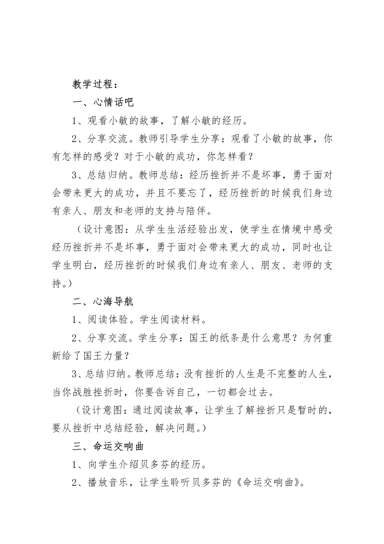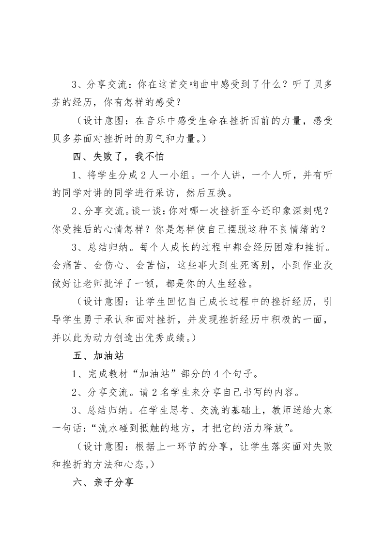三年级心理健康教案:失败了,我不怕设计背景小学三年级的学生对失败的认识和应对挫折的能力往往只停留在小范围的、浅层次的、个体的、表面的感性水平上。在遇到挫折时,他们常常希望能回避它,不愿或不敢面对挫折或寄希望于他人帮助解决,或无休止地责怪自己。行为上表现为手足无措、尽量拖延或消极等待。因此,教育学生正确面对挫折、从挫折中奋起、以更强的信心迎接新的挑战,形成能够经受挫折考验的健康心理,是儿童心理健康教育的重要环节。教学目标:1、让学生认识到失败知识暂时的,要勇于面对失败。2、让学生认识到挫折也有积极的一面。3、让学生学会以积极的心态面对挫折,并从中找到应对挫折的方法。教学重点:学生分享自己成长经历中的挫折,并能从中找到应对挫折的方法,找到挫折的积极一面。教学难点:营造一个安全真诚的课堂氛围,引导学生逐渐开放自己的内心世界。教学准备:视频、《命运交响曲》