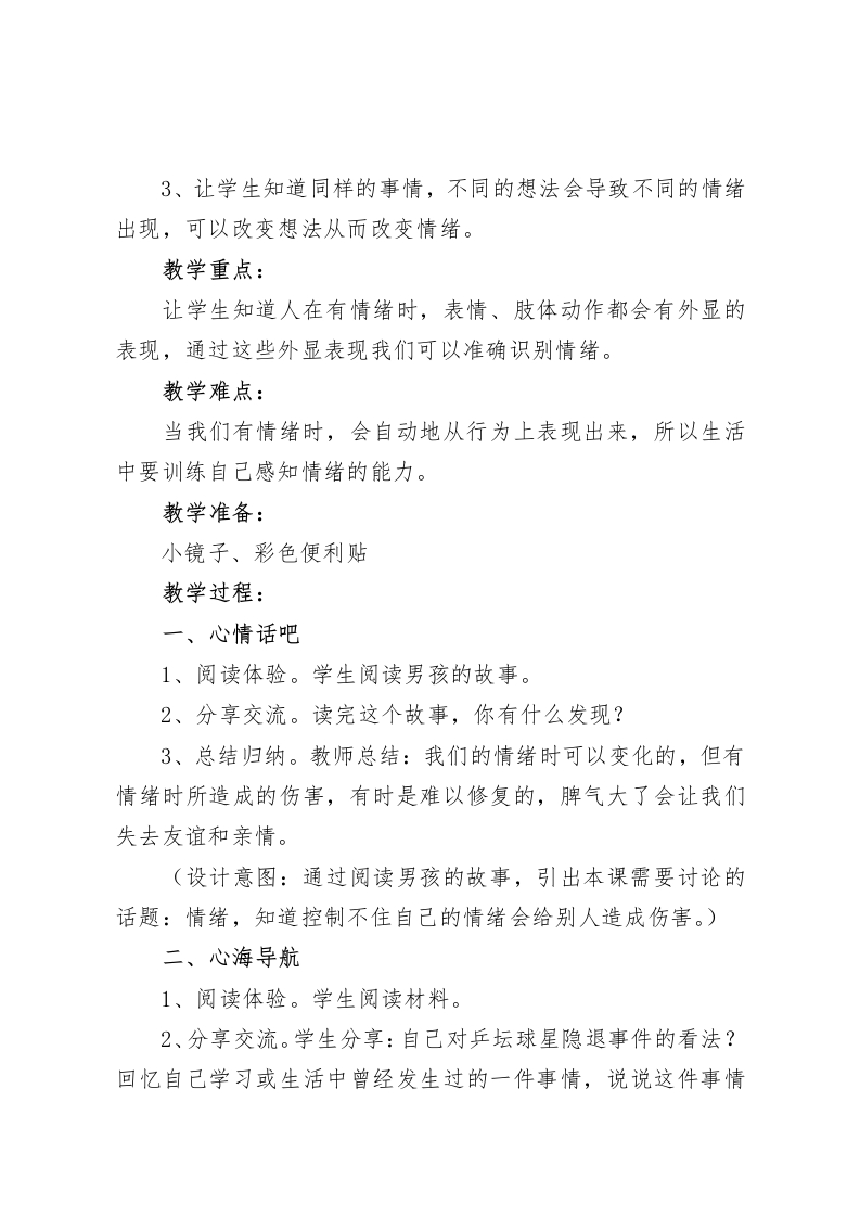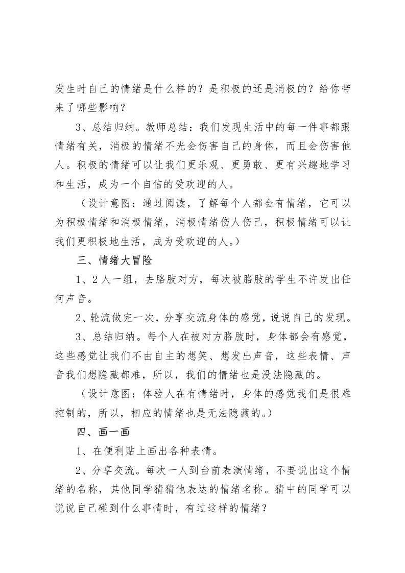 三年级心理健康教案:我的情绪我做主设计背景情绪是人们对于客观事物是否符合自己的需要而产生的态度体验。小学中年级学生的情绪特点有明显的两极性、不稳定性和外露性。两极性表现为高兴与生气等情绪体验,常从一个极端跳到另一个极端。此外,多数学生情绪表现外露,无论遇到高兴的事,还是伤心的事,他们不会掩饰,都会明显地从面部表情、动作上显露出来。不同的情绪常常会导致不同的行为表现,所以,小学生要知道情绪种类很多,最基本的情绪有高兴、惊奇、生气、厌恶、害怕、悲伤和愤怒等。我们可以通过面部表情、肢体动作等觉察和识别情绪,知道情绪是不可以压抑、否定或者任意放纵的,避免情绪伤到自己,这是学生认识情绪的基础。小学生学习适当的表达和管理情绪,才能达到宣泄的效果,从而避免负面作用。一个人只有了解自己的情绪,才能够懂得回应别人的情绪,才更愿意与人互动分享,才会收获等多的友谊。另外,情绪管理能力的提升可以让我们做事情时更专注,表现在学习上是提升注意力、记忆力和想象力,可以让我们的学习更高效。教学目标:1、让学生知道人人有情绪,情绪有积极和消极之分。2、让学生学会觉察有情绪时身体发生的变化。