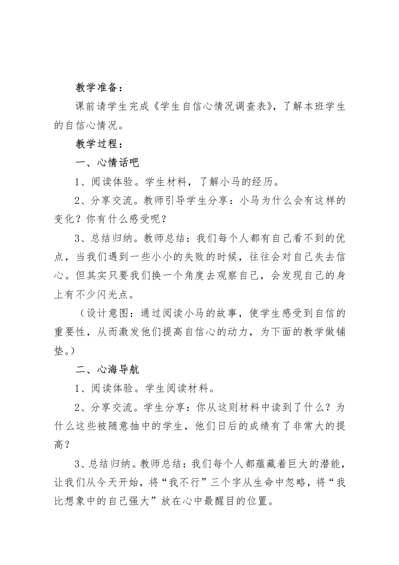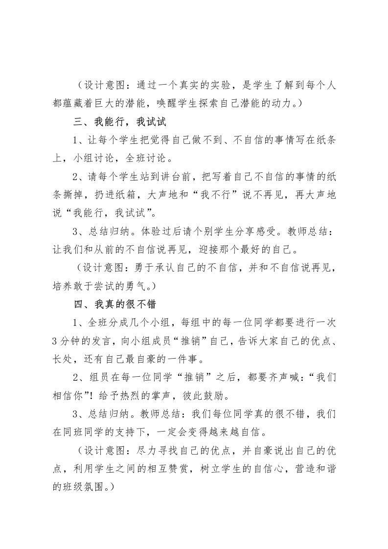 三年级心理健康教案:我真棒设计背景自信心是一个人成长所必备的良好心理素质和健康的个性品质,也是一种重要的非智力因素。自信心在小学生心理发展过程中具有十分重要的意义,它是小学生必需的“心理营养”,是一种必不可少的“心理免疫功能”。自信心一般来源于两个方面:对自己的肯定以及别人对自己的肯定和欣赏,在赞美和被赞美中发现自己的优点和别人的优点,提升自己的自信心。本课设计的富有感染力的文章、引人深思的故事、学生间的互动活动都能让学生认识到自信心的重要性,是学生获得内心的体验和感受,在潜移默化中激发他们的勇气,同时培养他们的自信心。教学目标:1、让学生了解自信心对自己的重要性。2、让学生学会培养自信心的方法,并在生活中能够加以运用。3、让学生通过活动了解自己的优点,培养学生积极向上的人生态度。教学重点:发现自己的优点。教学难点:引导学生去关注自己以及他人的内在品质和内在优点。