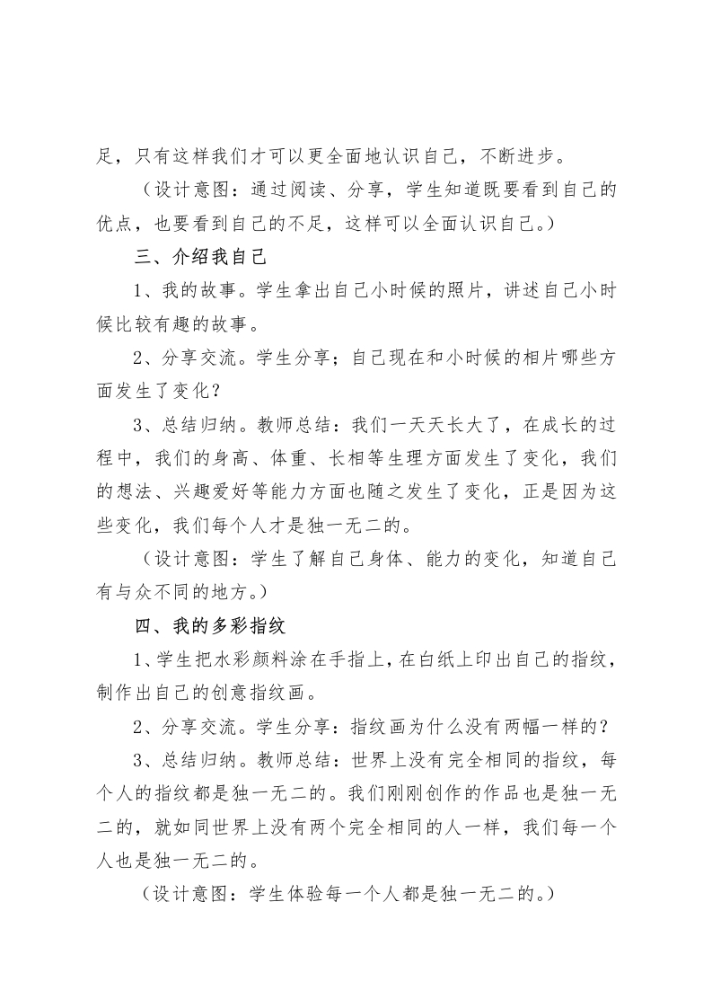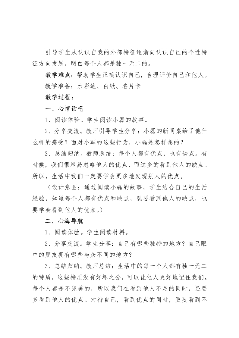三年级心理健康教案:照镜子设计背景自我认识是自我意识的认知成分。它是自我意识的首要成分,也是自我调节控制的心理基础。它包括自我感觉、自我概念、自我观察、自我分析和自我评价。小学对自我概念的认知主要还停留在具体的外部特征,但是随着抽象思维的发展,对自我评价开始有具体到抽象、由外显向内心发张。这个阶段是个体形成自信心的关键期,他们在接受别人的评价与同伴的比较中发现自身的价值,产生自豪感和自信心。小学生成长过程中最为重要的就是逐渐认识自己,作为教师我们要不断地研究与探索,必须通过多方面途径来帮助学生全面了解自己,帮助学生正确地认识自己、理解自己、悦纳自己,帮助学生调整好理想的自我和现实的自我之间的差距,引导他们学会正确地对待自己的缺点,并在努力克服困难的过程中获得成功和满足,以良好的个性迎接生活的挑战。教学目标:1、让学生知道每个人都有自己的优点和不足。2、让学生认识每个人都是独一无二的,发现自己与众不同的地方。3、每个人都不是完美的,让学生学会认识自己、理解自己、悦纳自己,才可以更好地成长。教学重点: