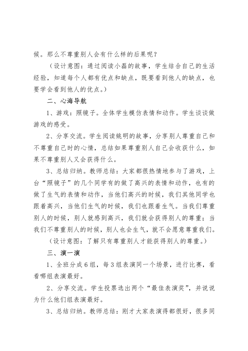三年级心理健康教案:尊重他人,尊重自己设计背景尊重指敬重、重视。人的内心都渴望得到他人的尊重。教学目标:1、让学生能够反省在生活中自己不尊重他人的行为。2、让学生能够知道尊重他人才能获得他人的尊重的道理。3、让学生在活动中体验如何尊重他人,体验由相互尊重带来的快乐。教学重点:学生通过角色扮演体验如何尊重别人,体验由相互尊重带来的快乐。教学难点:了解尊重别人才能获得别人的尊重。教学准备:教师准备一个自己不尊重别人的故事。教学过程:一、心情话吧1、阅读体验。学生阅读小帅的故事。2、分享交流。学生分享自己在生活中不尊重别人的故事,比如不尊重同学、朋友或者家人。3、总结归纳。教师总结:感谢每个同学诚实地分享了自己不尊重别人的故事,我们发现很多同学都会有不尊重别人的时