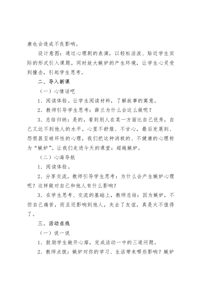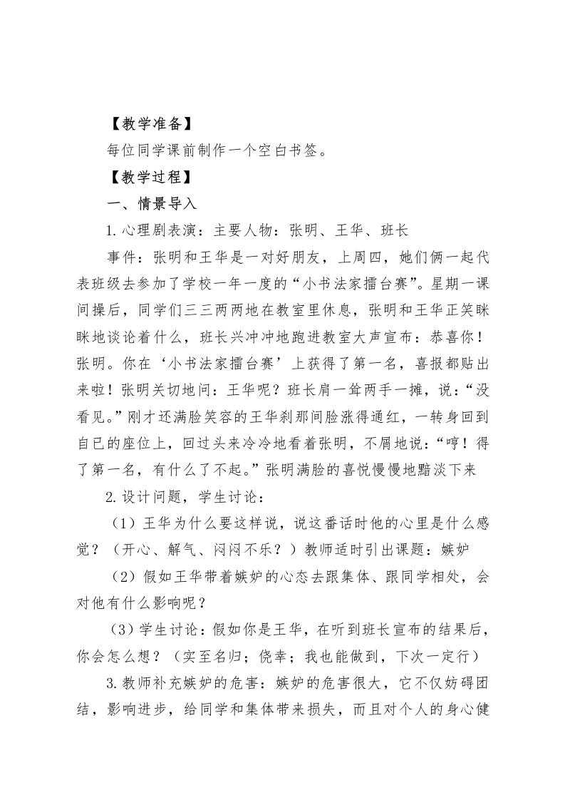 四年级心理健康教案:超越嫉妒【设计背景】小学生正处在长身体、长知识的关键时期,而嫉妒是阻碍学生健康成长的一块绊脚石。在生活和学习中他们希望自己各方面都比别人好,当看到别的同学获得成功或超过自己时,内心就会一时失衡,但又不能理性对待。同时家长和教师过分强调成绩也是触发孩子嫉妒心理产生的重要原因。因此,要重视学生的妒忌心理,积极引导,正确对待,使其转变成一种积极向上的动力。才会使每一个学生成长为心理健康、人格健全、全面发展的人。【教学目标】1.引导学生敞开心扉,分析嫉妒别人的不良现象及其原因,鼓励学生调节嫉妒心理。2.让学生联系案例和生活实际知道嫉妒的危害,教给学生缓解以及消除嫉妒的方法。3.正确认识自我,学会比较,培养健康积极的心理,养成活泼开朗的个性。【教学重难点】1.重点:引导学生敞开心扉,分析嫉妒别人的不良现象及其成因,鼓励学生调节嫉妒心理。2.难点:让学生联系案例和生活实际,知道嫉妒的危害,教给学生缓解嫉妒心理的方法。