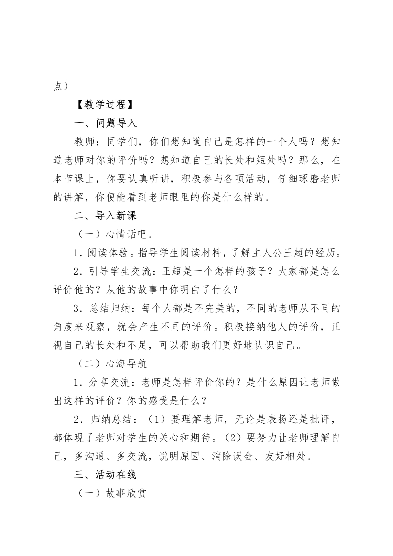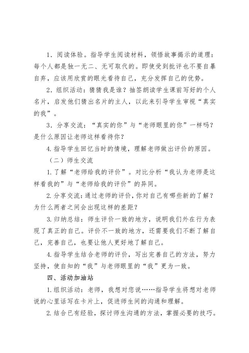 四年级心理健康教案:老师眼里的我【设计背景】师生关系作为学校生活中最基本的人际关系,不但是开展学校工作的心理背景,而且是老师和学生之间进行沟通和交流的纽带,有助于学生形成比较完善的性格。小学生特别重视与教师的关系,甚至超越与父母的关系。如果师生关系不和,那么学生就没有参与教育过程的积极性和主动性。引导学生理解、客观合理的评价老师,建立良好的师生关系,这对发展学生的个性起到至关重要的作用。【教学目标】1.正确地认识自我,悦纳自我,懂得用发展的眼光看待自我,提高自我评价的能力。2.了解“真实的我”与“老师眼里的我”的差距,能够不断完善自己,使自知的“我”与他人所知的“我”更为一致。3.正确看待老师对自己的评价,尊敬并理解老师,运用正确的方法与老师沟通,与老师友好相处。【教学重难点】1.重点:正确对待老师的评价,尊敬并理解老师,与老师建立良好的关系。2.难点:借助于他人的评价,认识自我,悦纳自我。【教学准备】学生自制个人名片一张。“我是的人”来介绍自己(优缺
