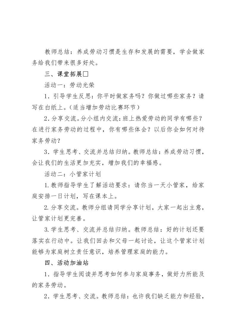 五年级心理健康教案:今天我当家【设计背景】父母疼爱子女是天性。不少父母在孩子未出生前,便开始学习如何照顾宝宝,阅读有关胎儿发展的书籍,参加各种育婴课程不断学习,可以说是用心良苦。可是有多少孩子会主动去学习了解父母,满足他们的需要呢?因此,让孩子参与家庭事务,做一些力所能及的事,不仅能培养孩子的独立性和责任心,还能促进孩子对父母辛劳的尊重和理解,从而使家庭关系更加和谐亲密。【教学目标】1.认识到做家务、参加劳动的重要性。2.能明确自己在家庭中应承担的责任。3.通过实践,培养热爱劳动的品质。【教学重难点】1.重点:认识到家务劳动的重要性。2.难点:培养学生热爱劳动的品质,积极参与家务劳动。【教学准备】白纸1张,家用物品【教学过程】一、课前汇报口1.汇报调查的结果:爸爸妈妈一天要做哪些家务事?2.数一数其中一个同学调查的爸爸妈妈一天所做家务的总