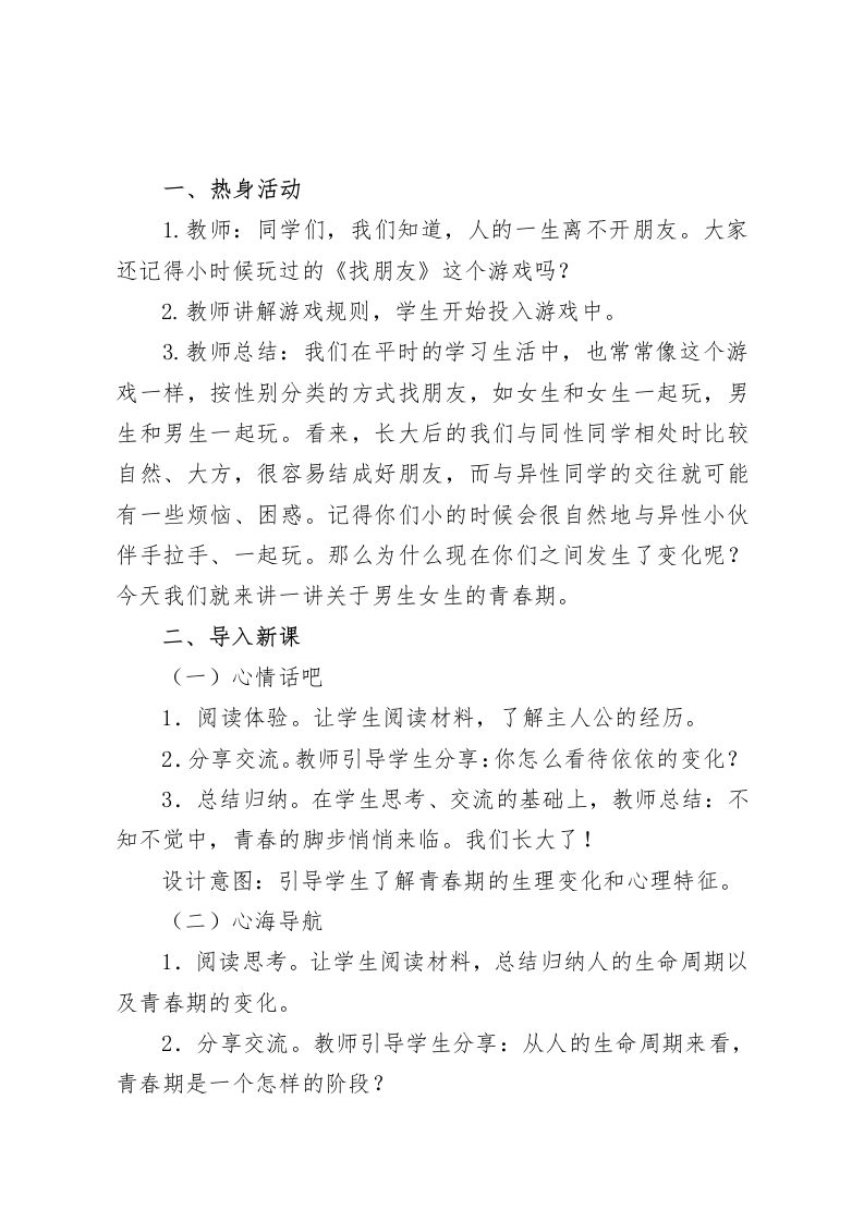 五年级心理健康教案:青春的脚步悄悄来临【设计背景】青少年时期是人的一生中最容易偏离心理正常状态从而导致不适应行为或心理健康问题的时期,是一个充满危机的时期。青春期是性器官和性机能迅速发育成熟的时期,性生理的迅速发育成熟必然带来心理的发展变化,特别是在教育引导不够的情况下,容易使学生的性心理表现出相对的幼稚性。因此,要引导学生认识到,青春期在人的一生中,无论在生理上还是心理上都是急剧变化的过程,帮助学生从容面对青春期的生理和心理变化。【教学目标】1.了解人的生命周期。2.懂得青春期是儿童逐渐发育为青年的过渡时期,是每个人成长发育的一个重要时期。3.悦纳青春期给自己带来的变化,以积极乐观的态度迎接青春期的到来。【教学重难点】1.重点:认识并接纳青春期的变化。2.难点:帮助学生从容面对青春期的生理和心理变化。【教学准备】让学生准备几张自己从小到大的照片【教学过程】