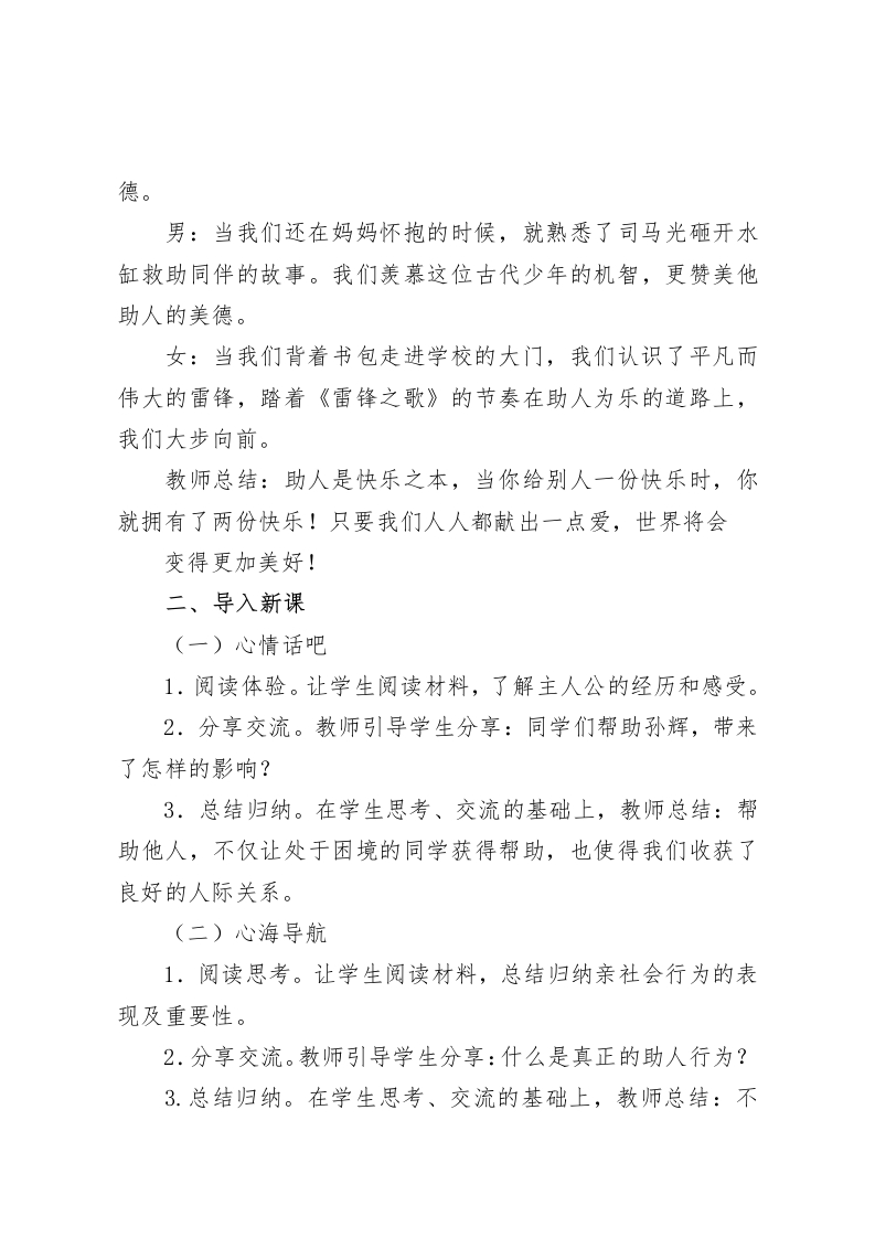 五年级心理健康教案:我助人我快乐【设计背景】在社会行为中,凡事利人而不求回报的行为,都是助人行为。人与人之间需要相互关心,相互帮助,共同合作,这是良好人际关系的催化剂。青少年有着较强的好强好胜心理,但对人际沟通中的信息处理还比较简单肤浅,常会因此失去获得帮助的机会,也会因此错过帮助别人的机会。只有通过具体的事件、情境,引导学生自己去领悟使学生将同情心升华为对待他人的正确态度。【教学目标】1.懂得亲社会行为的概念和重要性。2.明确助人不求回报,才能够体会到助人的快乐。3.培养学生的同情心,养成乐于助人的品格。【教学重难点】1.重点:培养同情心,养成亲社会行为。2.难点:认识到真正的助人是不求回报的。【教学准备】了解学生在助人方面的表现和困惑【教学过程】一、感知情境男:亲爱的同学们,我们中华民族有五千年悠久的历史。女:不但拥有灿烂的文化,而且铸就了中华民族的传统美