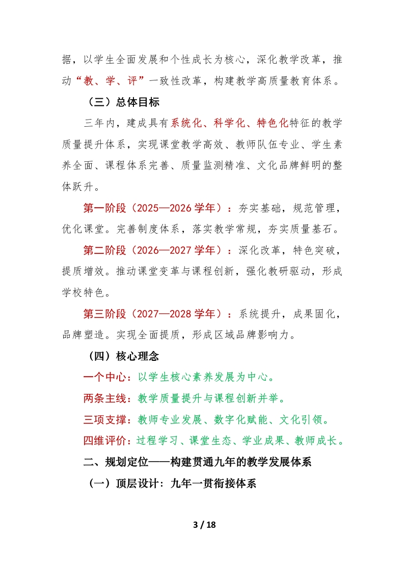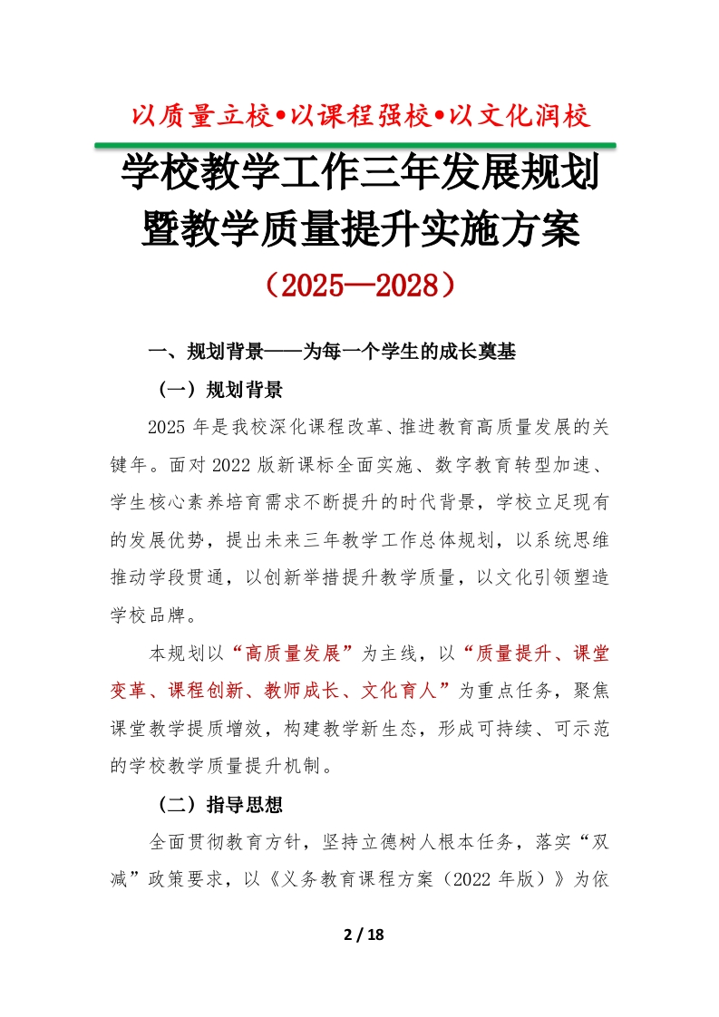 以质量立校·以课程强校·以文化润校学校教学工作三年发展规划暨教学质量提升实施方案(2025—2028)一、规划背景—一为每一个学生的成长奠基二、规划定位一构建贯通九年教学发展体系三、核心工程一一课堂变革与教学提质工程二、核心工程二一一教师成长与教研创新工程三、核心工程三一一质量监测与精准提升工程四、核心工程四一课程创新与跨学科融合工程五、核心工程五一数字赋能与智慧教学工程六、核心工程六一文化育人与品牌建设工程七、保障与实施一以系统管理保障教学高质量发展八、考核与评估一一以数据与过程管理推动提质增效九、阶段推进与任务分解十、宜传推广与成果展示1/18
