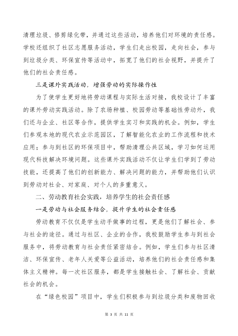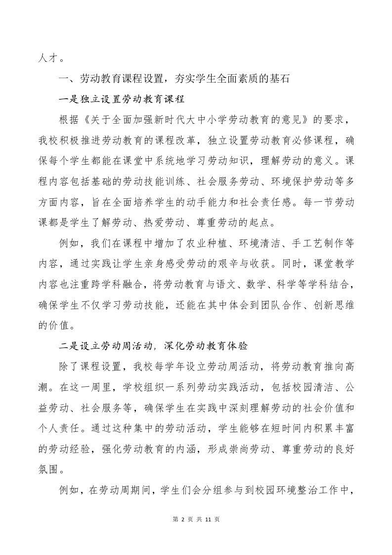 学校劳动教育特色汇报材料上好“劳动”这堂必修课劳动教育课程家校合作独立设置劳动墩育必修课程家长反馈了解学生在家庭中的劳动技能训练、社会服务劳动成果家庭劳动表现,劳动教育贯穿到鲸环垃保护劳动等展示协作庭生活的每个细节中劳动周活动社会实践学校组织一系列劳动实践活动,包括校园清洁社会劳动《通过与社会各界的合作我校为学生捉供了丰帘公造劳动、社会服务实践引导的社会实跋机会创新与劳动教育劳动模范参与到“智能农业”项目课程漱励了获奖学生,也通巾,如何利用现代科技手成果过榜样的力量段解决农业的实际问题设置联评劳动成果展示课程设计劳动价值观在芳动成果展示会上,学生们通过社会的评价和反愤,学展示的手工艺品和农业收获都实践活动社会责任生们史加理解劳动的意义得到了家长和社会的广泛认可劳动是人类社会创造财富的源泉,是推动社会不断发展的力量。《关于全面加强新时代大中小学劳动教育的意见》明确提出,在大中小学设立劳动教育必修课程,每学年设立劳动周,以此来培养学生的劳动意识和创新精神,培养具有社会责任感、创新能力的新时代人才。我校始终紧响应教育部发布《义务教育劳动课程标准(2022年版)》,积极推进劳动教育课程的独立设置和劳动实践活动的开展,致力于通过一系列的劳动教育举措,让学生在劳动中收获知识,在实践中提升素养,为他们的全面成长奠定坚实基础。以下报告将围绕“课程设置、实践活动、社会责任、成果展示”等六个方面,详细阐述我校劳动教育的实施情况,展现劳动教育如何成为学生成长的引擎,并推动他们成为德智体美劳全面发展的新时代第1页共11页