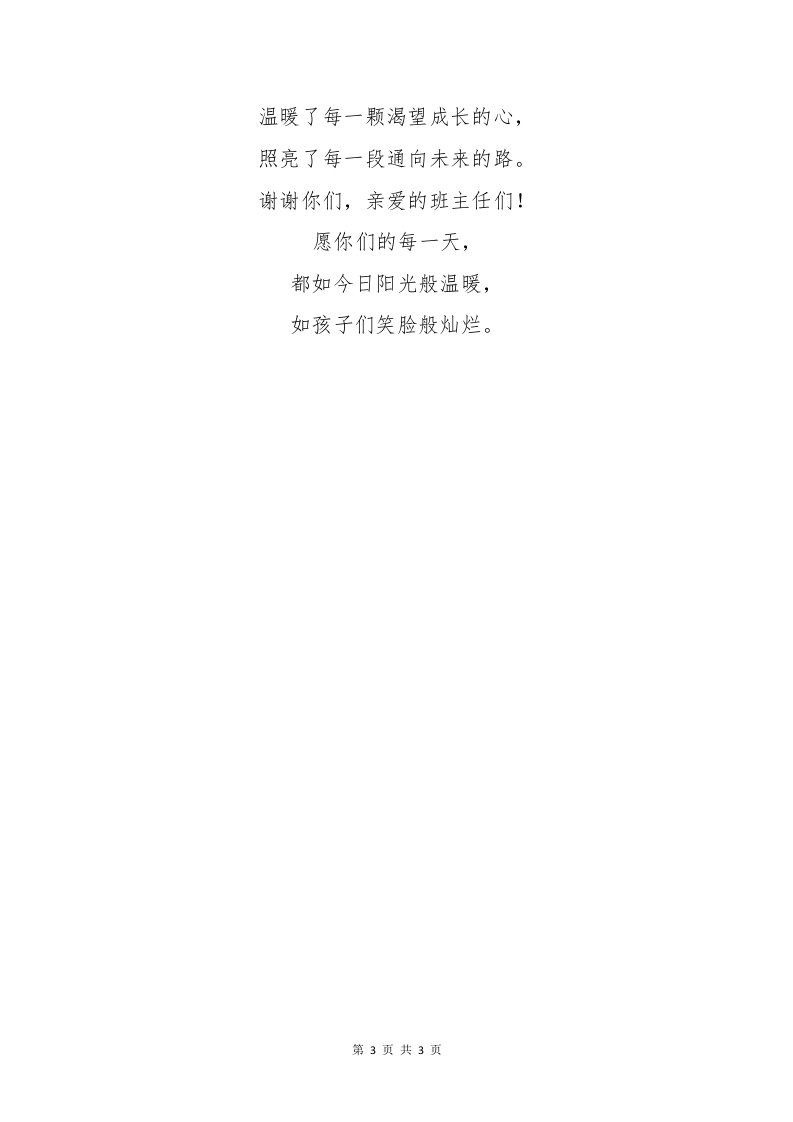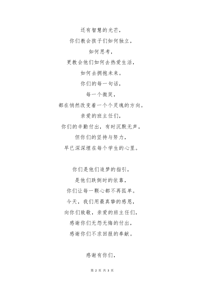 班主任节朗诵稿感谢有你,温暖每一颗心亲爱的班主任们:你们是黎明前的那束微光,在无声无息中,照亮了孩子们前行的道路。你们的身影,是每一位学生心中最温暖的依靠,你们的爱与责任,深深地镌刻在他们的记忆里。班主任,你们不仅仅是知识的传递者,更是心灵的抚慰者,是孩子们成长路上的引路人。你们用心灵去教化,用耐心去陪伴,在每个风雨交加的日子里,你们是他们不言放弃的力量。在你们的课堂上,不仅有知识的海洋,第1页共3页