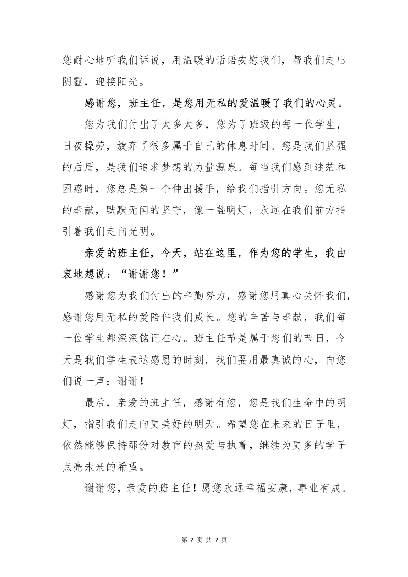 班主任节学生讲话稿感谢有您亲爱的班主任们,尊敬的各位老师,亲爱的同学们:大家好!今天,是一个特殊的日子班主任节。在这一天,我们齐聚一堂,怀着感恩的心情,向我们亲爱的班主任表达最真挚的谢意。作为学生,我站在这里,心里充满了无尽的感激与敬意。感谢您,班主任,是您带领我们走进知识的殿堂。每一次上课,您总是耐心地讲解,把知识从您的心中传递到我们的心里。您教会我们如何思考,如何探索,如何用更广阔的眼界去看待这个世界。您不只是教会我们课本上的知识,更教会了我们如何做人,如何面对生活中的种种挑战。每当我们遇到困难时,是您在背后默默鼓励我们,给我们信心,让我们勇敢面对一切,战胜困难,迎接更好的未来。感谢您,班主任,是您陪伴我们度过了一个又一个成长的瞬间。班主任不仅是我们的老师,更像是我们的朋友,您的关怀无时不在。在我们成绩优秀时,您微笑着鼓励我们,告诉我们可以更好:在我们遇到挫折时,您总是耐心地开导我们,给我们力量,让我们重新站起来,继续前行。您关心我们的学习成绩,更关心我们的心理健康。每一次心情低落时,是第1页共2页