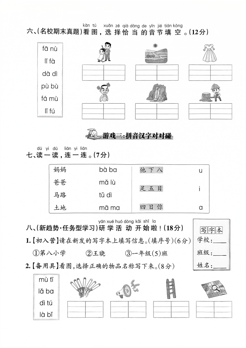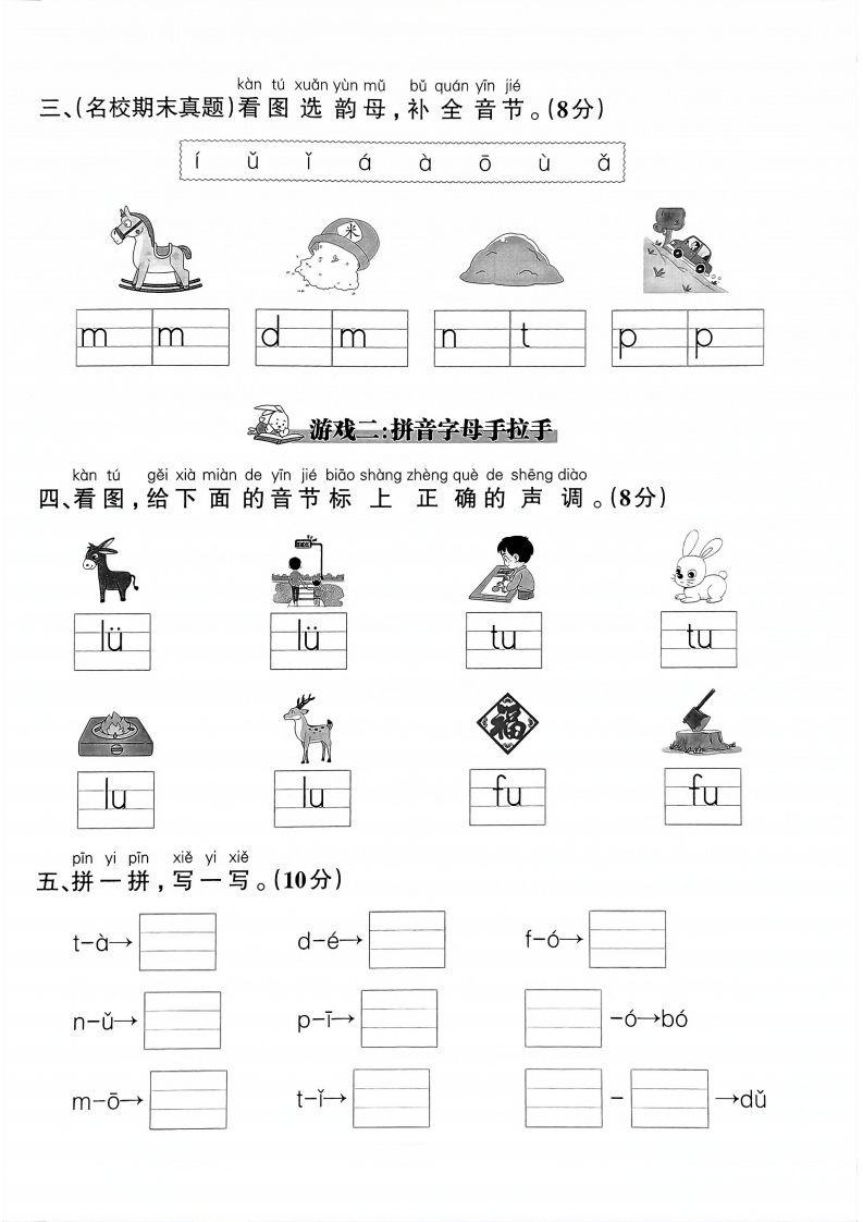 2025-2026学年一年级上册语文情境素养卷第二单元情境素养卷时间:60分钟满分:100分小朋友们,欢迎来到拼音主题乐园,我们一起来玩拼音游戏吧!靴弥游戏一:火眼金晴辨字母kan tuwan cheng lian xi一、(新趋势·情境学习)看图,完成练习。(16分)1.找一找图中藏着的字母,写在对应的四线格中。(8分)如我封2.按要求给上面图中的字母分类。(8分)单韵母:声母kan tu xuan ze he shi de sheng mu bu quan yin jie二、(教材核心题)看图,选择合适的声母补全音节。(6分)线b-dt一fú
