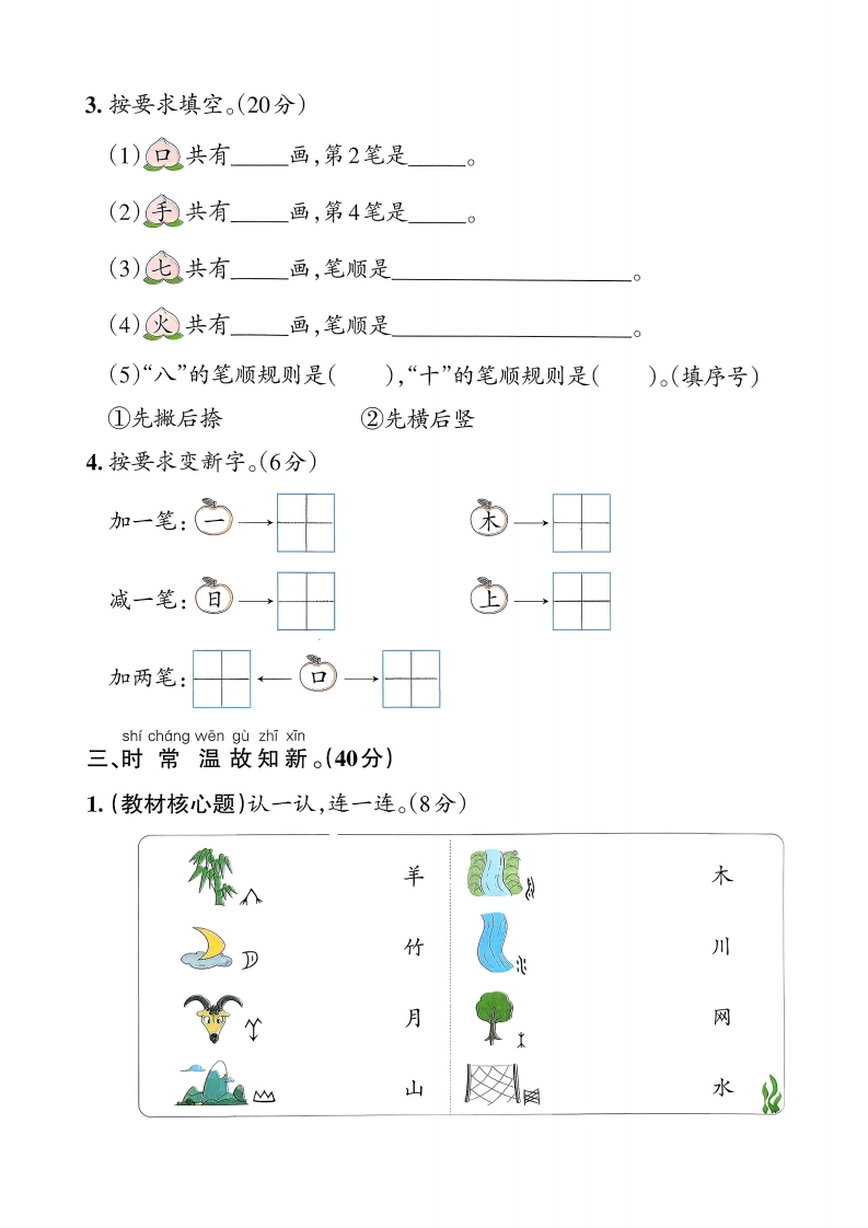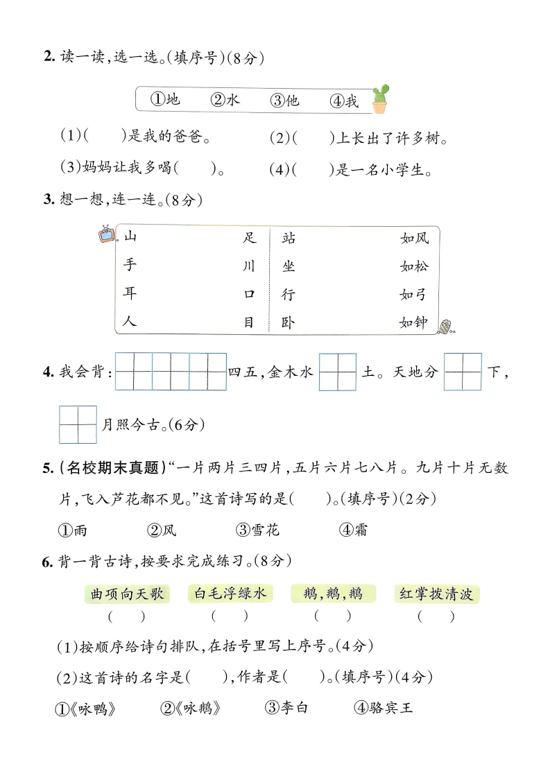 2025-2026学年一年级上册语文情境素养卷第一单元情境素养卷时间:60分钟满分:100分开学啦!小朋友们,你知道开学第一课要做好什么吗?弥yang cheng liang hao xi guan养成良好习惯。(12分)1.(名校期末真题)看图,在正确的读写姿势下面打“V”。(2分)毁2.想一想,选一选。(填序号)(10分)封①足②手③目④口⑤耳丁零零,上课了。老师讲,用()听。看黑板,要用()。有问题,先举()。提问时,要起立。两()立,张()说。ren zhen gui fan shu xie二、认真规范书写。(34分)1.(新趋势学科融合)看图数一数,写一写。(4分)》承片(piàn)大海(hi)只鸟(niǎo)儿线个伙(huǒ)伴(bàn)只海星(xng)2.看图写汉字。(4分)
