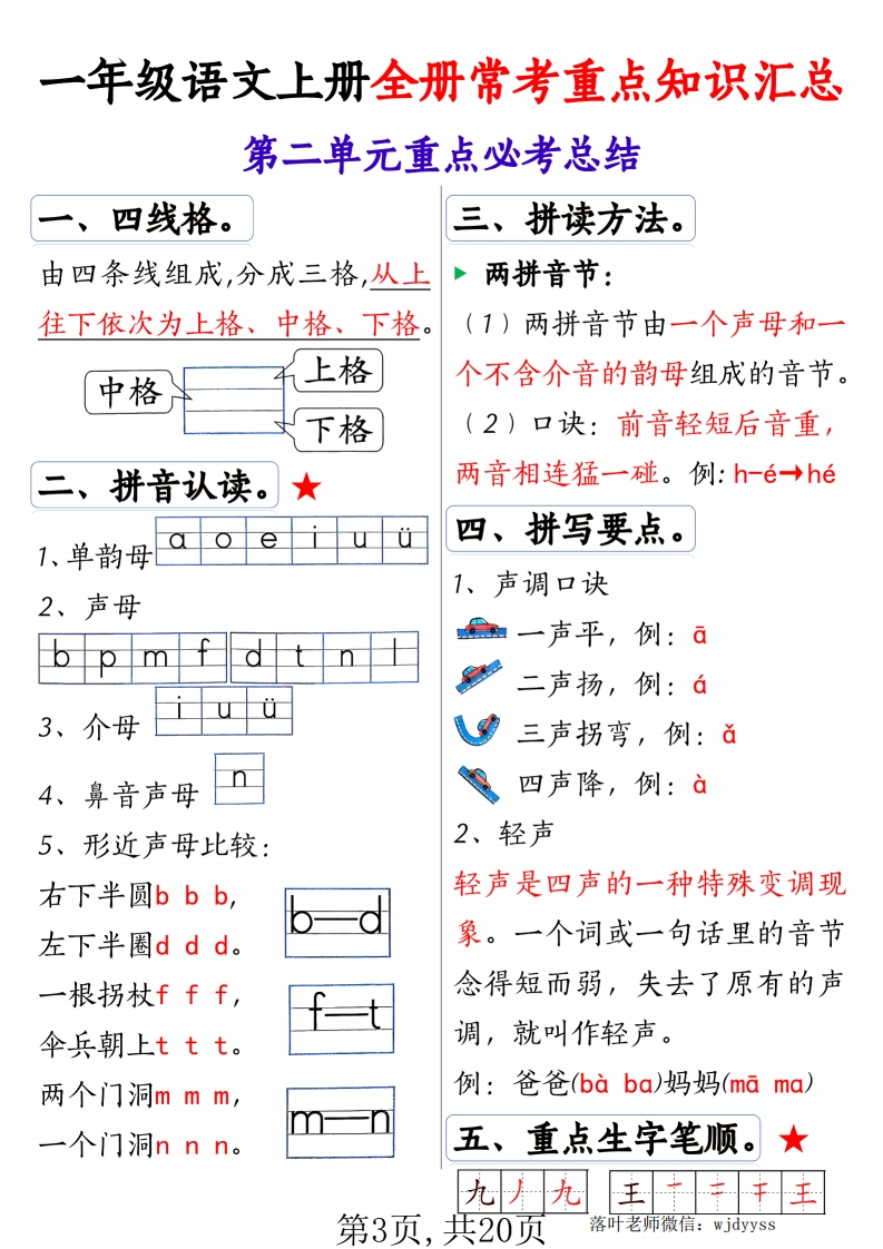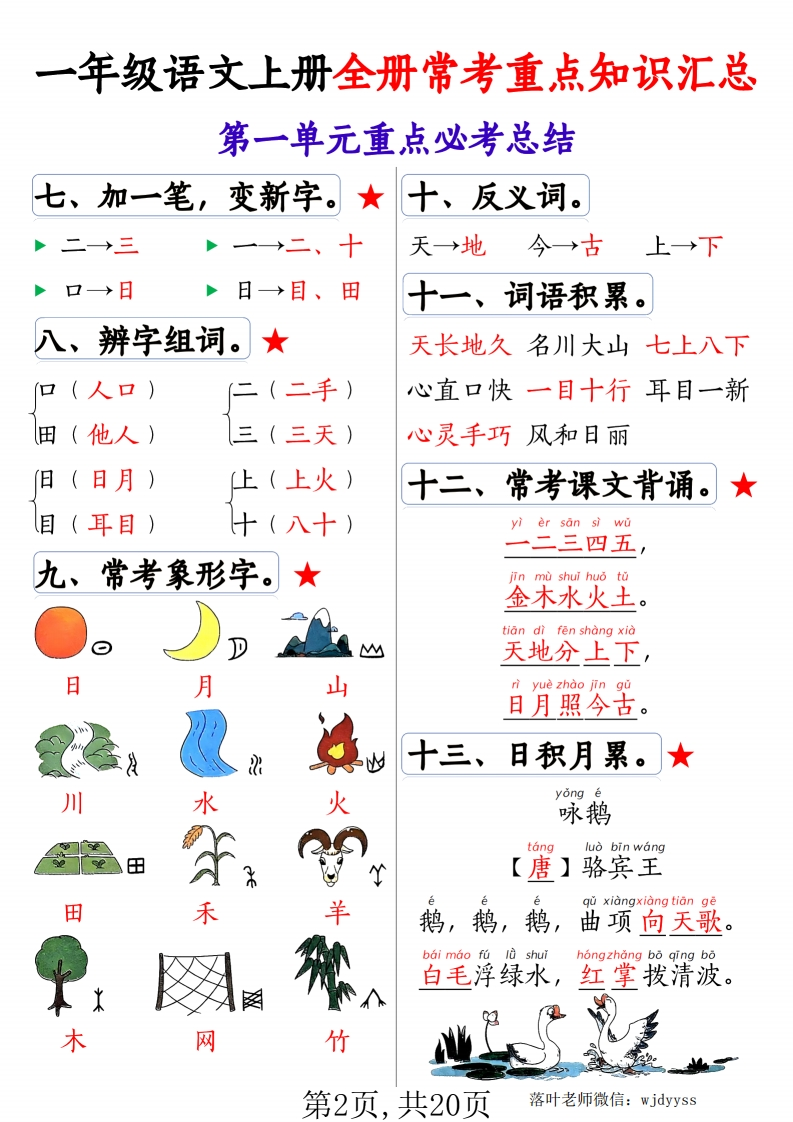 一年级语文上册全册常考重点知识汇总第一单元重点必考总结一、田字格。火少火四画写字时,要注意笔画在田字格田五画中的位置。右上格五画左上格横中线六产六四画左下格右下格竖中线四、笔顺规则。二、易错字音。★从上到下:二、天(tian)地(di)人(ren)先横后竖:十、禾手(shu)足(zú)下(xià)五、重点笔画。★站(zhdn)你(ni)坐(zuò)横:一竖:上山(shan)我(wǒ)月(yue)横折:口撇:手水(shuY)他(tā)四(si)九(jiǔ))霄钩:手八点:火耳(ěr)上(shàng)川(chuan)捺:禾竖弯钩:七三、重点生字笔顺。★六、重点词语。五画yi rener yuesan tianshangshan一人二月三天上山耳中耳六画ren kouer mushoushangri zi人口耳目手上日子手「手huo shantian dihe miaoliòge四画火山田地禾苗六个日月月日qi riba ren四画七日八人牛兰ri yue日月第1页,共20页落叶老师微信:wjdyyss