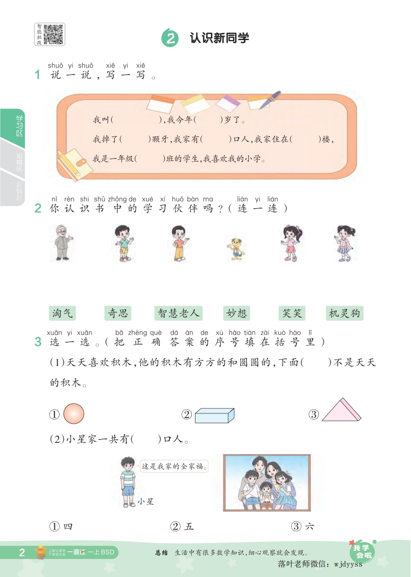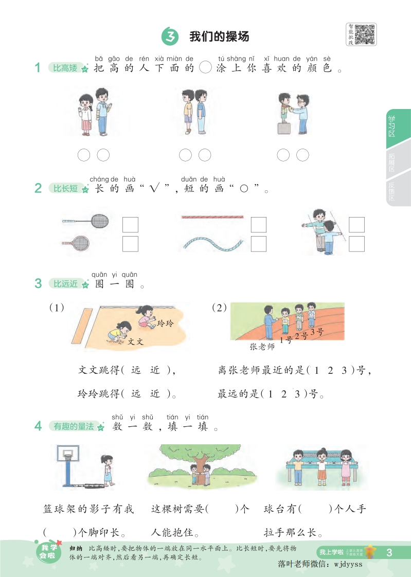 97我上学啦可爱的校园w000000DD00四四四团四①四而可四m四四如四学习区区shǔyishǔlian yi lian1数一数,连一连。叫417938ren yi ren zai yuanyuan de wu pin xid mian de kuo hao li hudi2认一认,在圆圆的物品下面的括号里画“O”,在chang chang defang fang de wùpin xiàmian de kuo hao li hud长长的、方方的物品下面的括号里画“口”)(shu yi shu you jr ge ren zhao yang zi quan yi quan3数一数,有几个人?照样子圈一圈a图上有(8910)个人。有(123)个人在跑步。有(456)个人在跳绳。领奖台上有(345)个人。会啦启示数学不仅仅是数数、数字,图形也是数学,欢迎来到致学世界!我上学啦落叶老师微信:wjdyyss