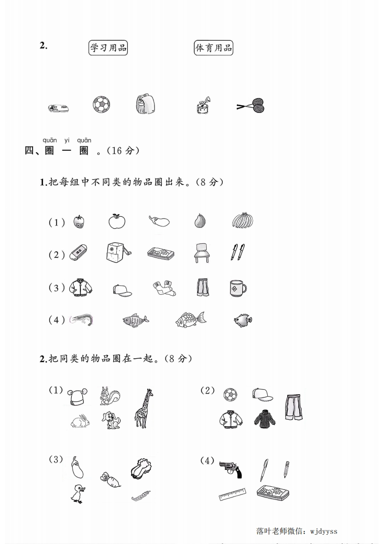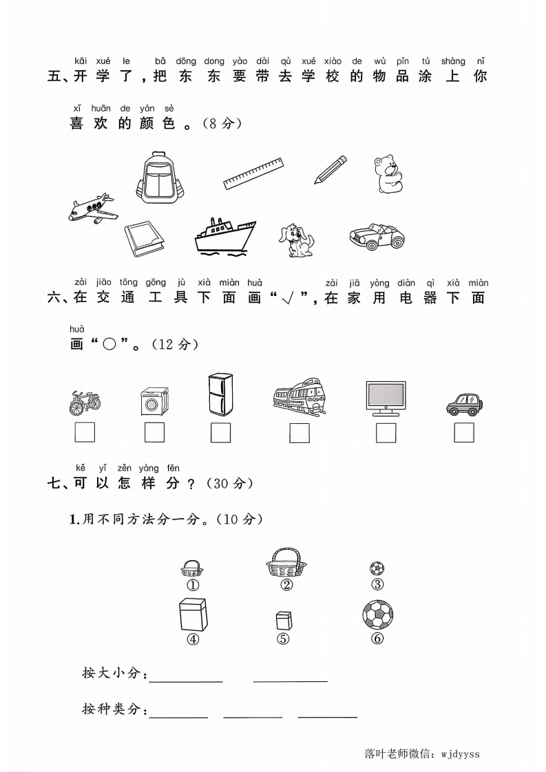 2025北师大版一年级数学上册单元测试卷第三单元测试卷时间:60分钟满分:100分+10分题号三四五六七附加题总分得分xiang yi xiangtian yi tian想一想,填一填。(填序号)(12分)团①②③④⑤翼线⑦⑧⑨①天上飞的地上跑的水里游的内f径nyifentianyi tian!不!二、分一分,填填。(填序号)(12分).①②③容要:1答12毁⑤⑥⑦⑧题1.按形状分:()()()()。2.按颜色分:()()。lian yi lian三、连一连。(10分)1()D落叶老师微信:wjdyyss