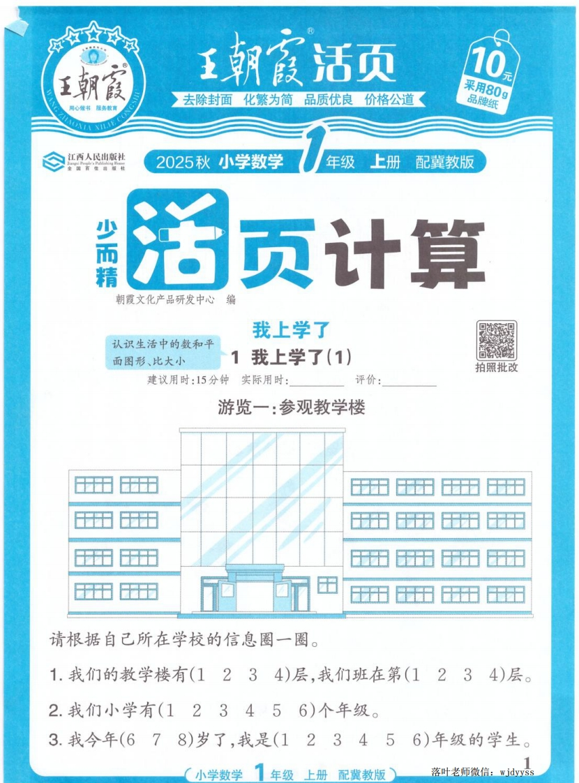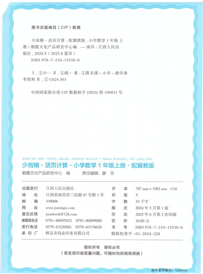 王朝霞活页102王朝酸中国无封面活页教辅品类开创者采用80g来源:基于弗若斯特沙利文对中四内地(不含港澳台地区)无好面活页教精市场的独研完品牌纸去除封面化繁为筒品质优良价格公道▣少而精活页计算目录计算方法2025秋小学数学活页计算年级上册配冀教版我上学了期中综合练习391我上学了(1)》三认识11~20小学数学2我上学了(2)111~20各数的认识41一熟悉的数与加减法1211~20各数的组成卡4040010400400000404。4311~5各数的认识…5年3比较20以内数的大小4526一9各数的认识…743认识“>”“=”“<”10加几和相应的减法47上954几个和第几个复习11~20各数的认识及相关计算0400t。000.000404.400044011配5合与分.................134965以内的加法15思维提升趣味算(二)一户外活动…51教版75以内的减法17四20以内的加法8复习5以内的加减法…191十几加几04940449444440404840t0+0000000t5396,7的加减法2129加几55108,9的加减法2338加几0004440444444…4444444+t4+4+44+0+0g57110的认识和加减法2547,6加几591210的认识…27连加611310的组成和分解296复习20以内的加法631410的加减法31思维提升趣味算(三)—趣味填数…6515复习10以内的加减法…33©思维提升趣味算(一)—我是小小消防员五探索乐园年4+44年e。:年。。年,。。35探索规律67二认识图形(一)期末综合练习69认识立体图形和图形的拼搭37参考答案71210-15530=0江西人民出版社25H0410402011全国首雀出服社定价:10.00元落叶老师微信:wjdyyss
