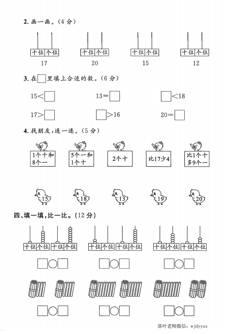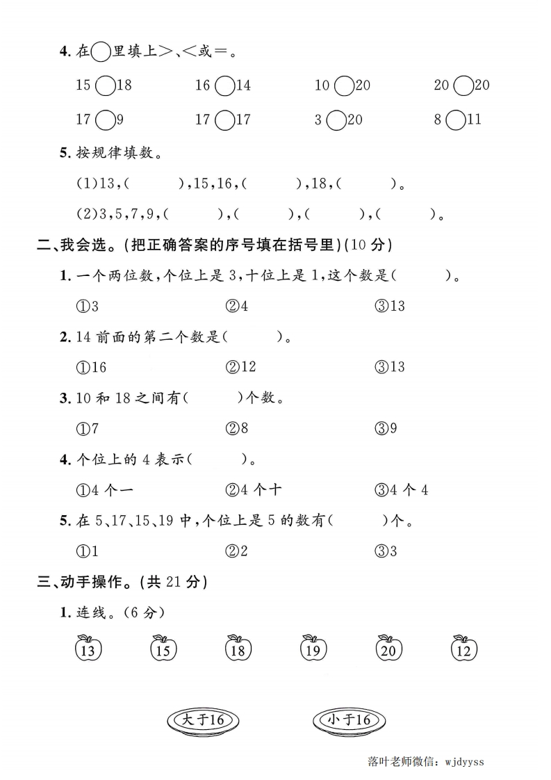 2025冀教版一年级数学上册单元测试卷第三单元测试卷(时间:60分钟分数:100分)一、填一填。(每空1分,共37分)1.看图写数。888十位个位十位个位…2.(1)19里面有()个十和()个一,20里面有()个十或()个一。(2)11和18这两个数中,()更接近15。(3)15后面的第5个数是()(4)数位顺序从右边起,第一位是()位,第二位是()位。3.8611101982014(1)从左边数,8是第()个数;从右边数,第5个数是()。(2)上面这几个数中,比20小且比10大的数有()个。(3)把上面的数按从大到小的顺序排列。()>()>()>()>()>(0>(落叶老师微信:wjdyyss