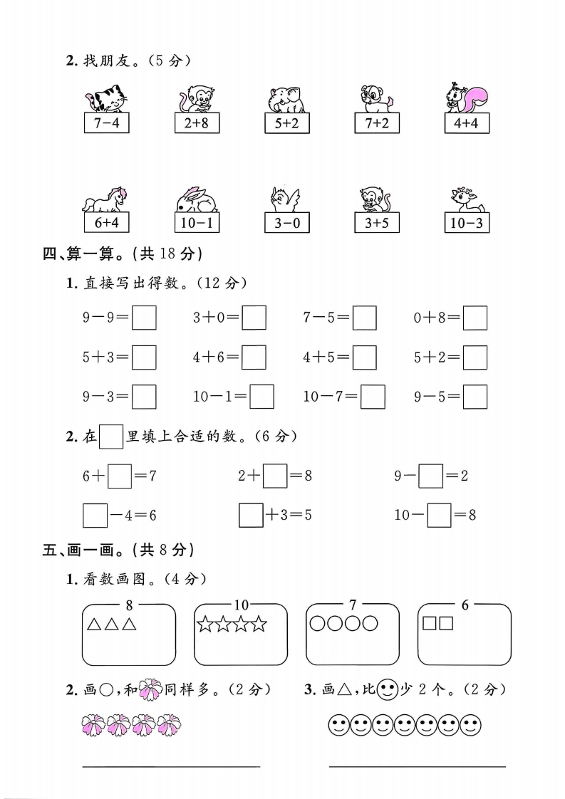 2025冀教版一年级数学上册期中测试卷(时间:60分钟分数:100分)一、填一填。(第1题6分,其余每空1分,共29分)1.数一数,比一比。0以0以0☆☆000牌嗯003☆☆☆O)O心■O■2.按顺序填数:(),2,(),6,8,(3.照样子,填一填。6D公3)号在⑤号的前面,()号在②号的后面。①号在②号的()面,①号在⑤号的()面。(1)一共有()只小动物,从左边效,爱排第()”爱排第()。(2)把最右边的4只小动物圈起来,在从左边数第2只小动物的下面画“△”。