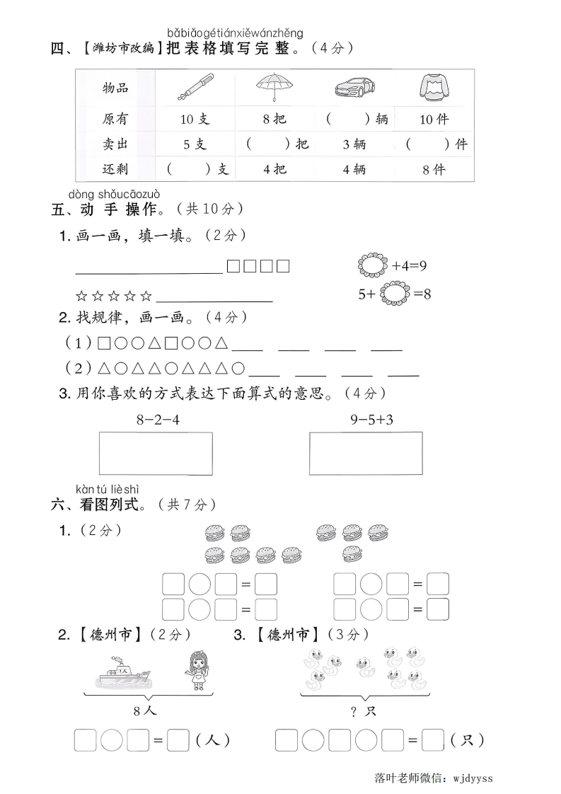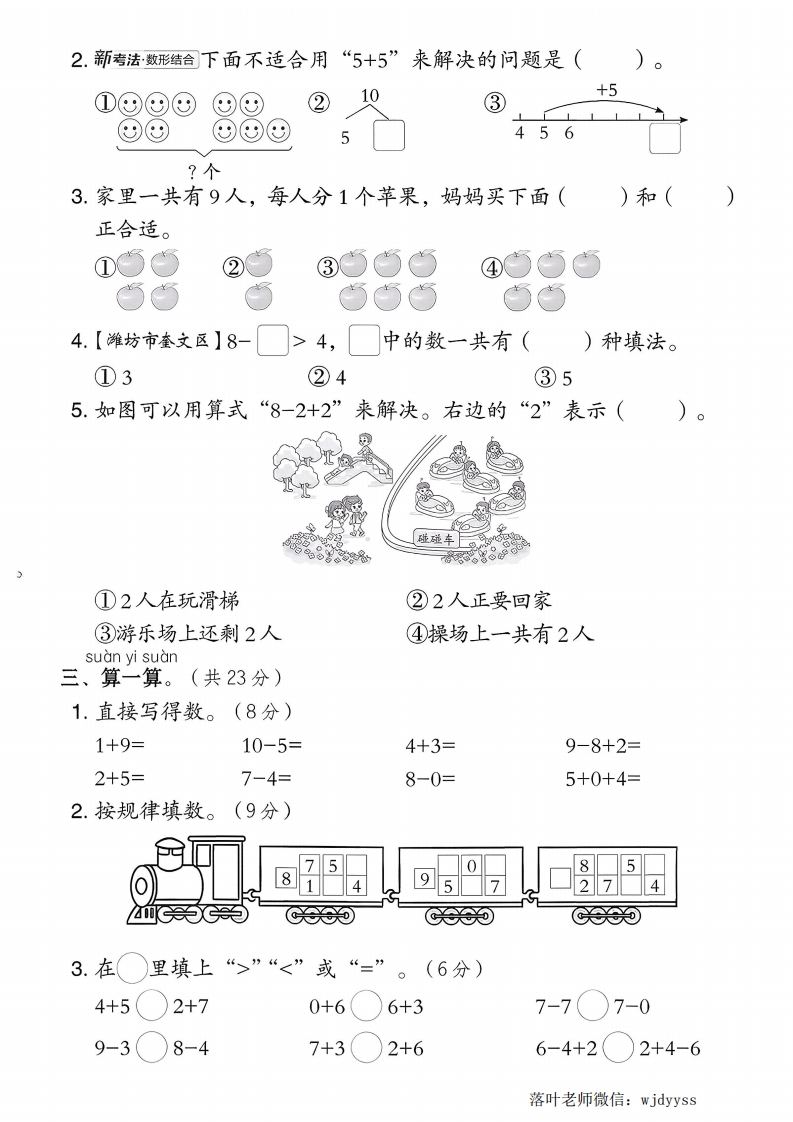 2025青岛63制一年级数学上册第二单元测试卷时间:60分钟满分:100分tian yi tian、填一填。(第2题6分,其余每空1分,共31分)1.在里填上对应的数。韶妆妆女每次少()个女。2□○□=□(个)读作:()加()等于()ooO00□○☐=□(条)读作:()减()等于()。封3.【日照市改编】8和10中间的数是(),它前面的第4个数是()04.比10少3的数是(),比5多4的数是(),()比8少25.另一只手抓了几颗糖?想一想,填一填。共8颗共6颗共7颗颗颗路6.将下列算式按得数从小到大的顺序排一排。9-28-3+15+07-45-56+2+2线()<()<()<()<()<(7.学科素养运算能力把1、2、3、4、5填入○里,使每条线上三个数相加的结果都相等。xuan yi xuan二、选一选。(每题2分,共10分)1.下面能用“10”表示的是(①②③落叶老师微信:wjdyyss