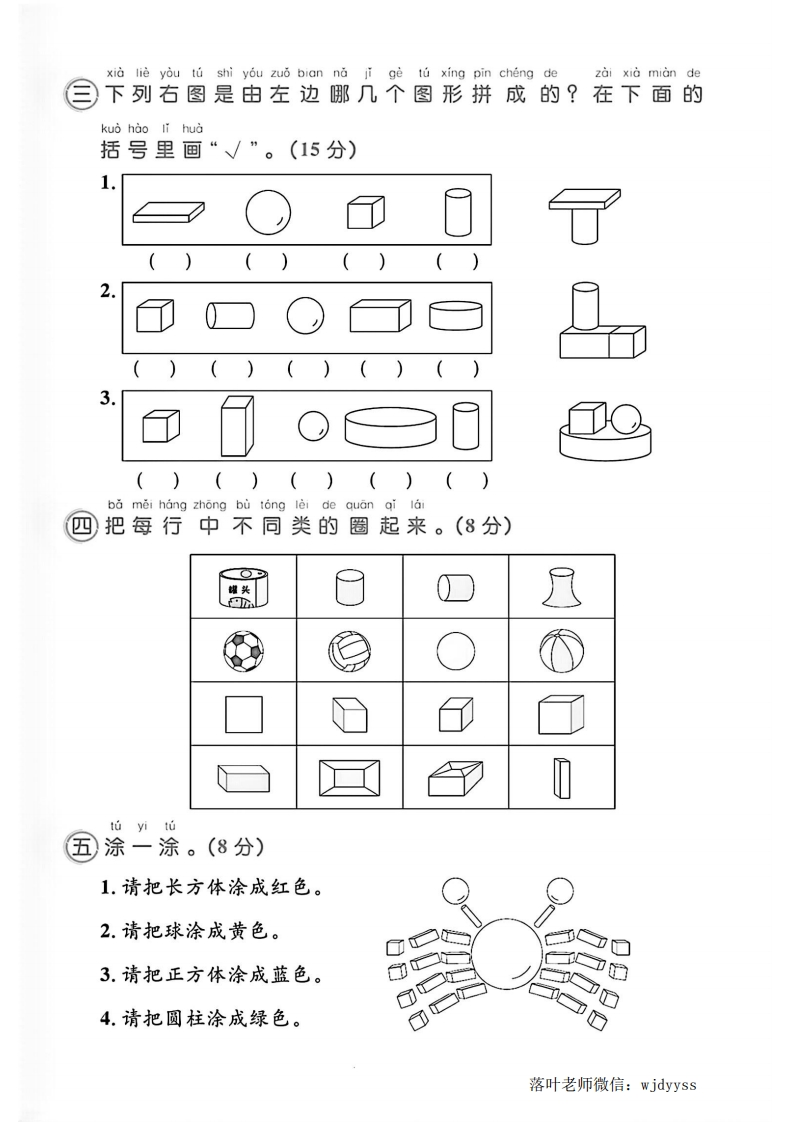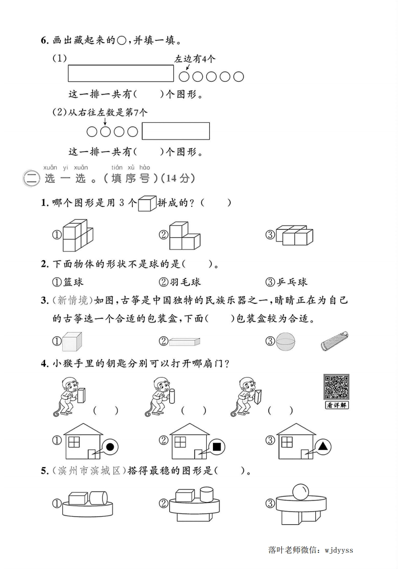 2025青岛63制一年级数学上册单元测试卷第三单元测试卷密⊙测试时间:40分钟⊙满分:100分+卷面:5分评价毁xiang yi xiang tian yi tian想一想,填一填。(19分)1.(滨州市沾化区)数一数,填一填。)个)个童)个)个封(1)从左边数,第()个是○,第()个和第()个是日(2)○左边的一个是(),右边的一个是()。3.(新角度)如图,把一根圆木锯了4次,可以锯成()个小圆柱。0○4.把一张长方形的纸卷一卷,折一折,能折出什么图形?线5.数一数,填一填。()个()个可)个了落叶老师微信:wjdyyss