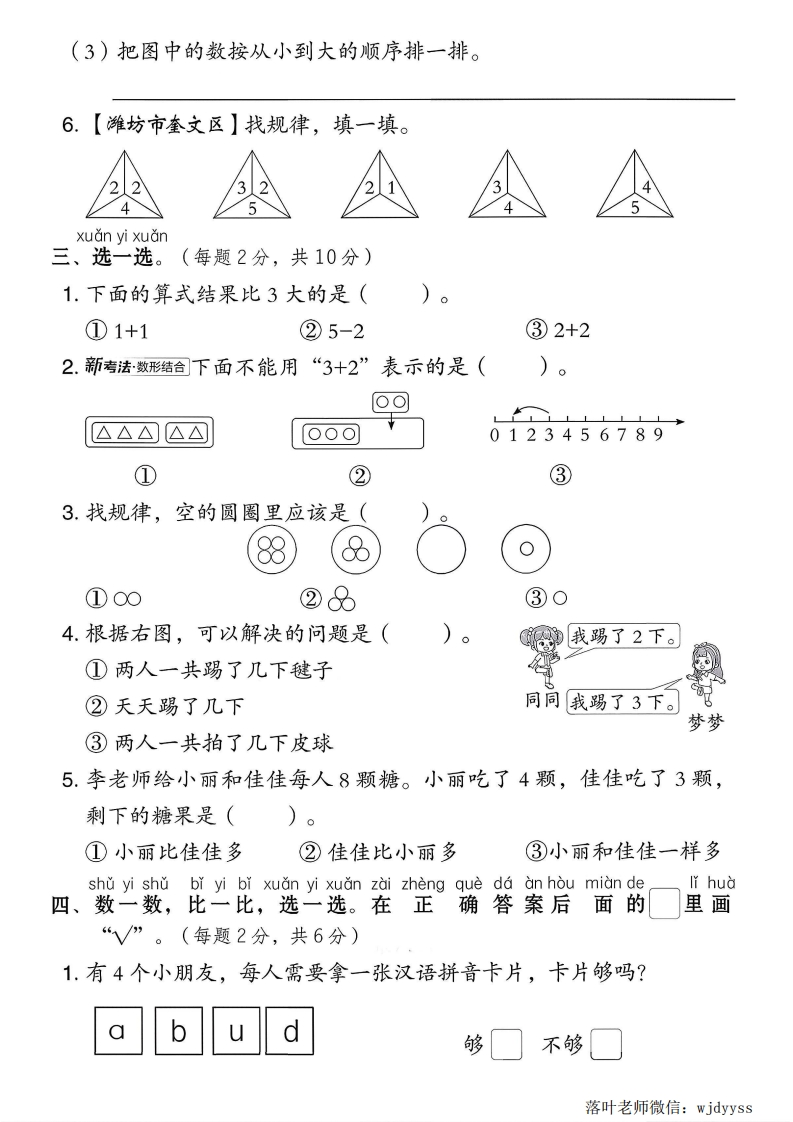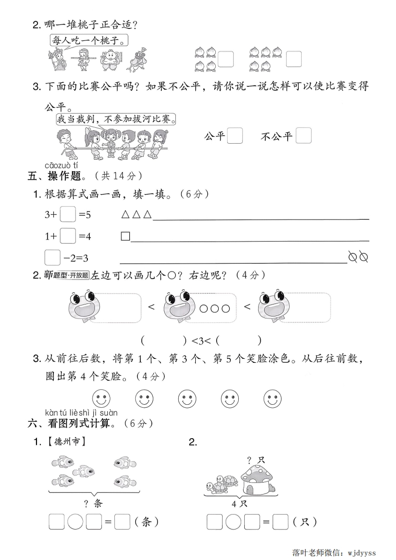 2025青岛63制一年级数学上册第一单元测试卷时间:60分钟满分:100分kan tu xiěshù【济宁市改编】看图写数。(每空2分,共10分)的斯弥tian yi tian二、填一填。(第1题8分,其余每空1分,共35分)□○□=□(个)般读作:()加()等于()。怀嘟怀哪深□○□=□(条)读作:()减()等于()。2.心中有数。封3+1=4-3=5-2=2+2=4=34-2=11+2=5-=33.5比3多(),4比()少1。4.轻松比大小。填在哪儿?站41(4324线3+154-2()12+23+15-32+15.【青岛市市北区】53(1)一共有()个数,最大的数是(),最小的数是()。(2)比4小的数有(),比2大、比5小的数有()。落叶老师微信:wjdyyss