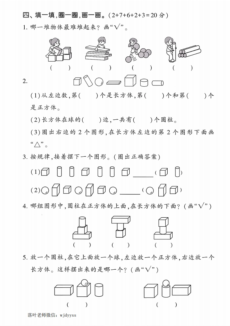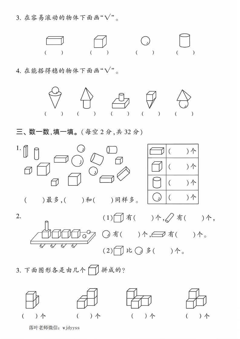 2025人教版一年级上册数学第三单元达标测试卷(1)tangqi884天前发布关注私信1.81MB6页0486 第1页 / 共6页 第2页 / 共6页 第3页 / 共6页 试读已结束,还剩3页,您可下载完整版后进行离线阅读 2025人教版一年级上册数学第三单元达标测试卷(1)此内容为付费资源,请付费后查看¥9.9¥19.9VIP会员免费立即购买您当前未登录!建议登陆后购买,可保存购买订单付费资源© 版权声明本站是一个信息分享及获取的平台,不确保部分用户上传资料的来源及知识产权归属,资料由老师投稿,公开渠道整理,网友上传,如果侵犯到您的权益,请联系客服删除THE END教师资料 文本预览 2025秋季人教版一年级上册数学单元测试卷第三单元达标测试卷时间:40分钟满分:100+10分题序二三四五六附加题总分得分一、我会连。(共10分)》长方体正方体圆柱球aa童二、辨一辨。(每题3分,共12分)1.在是长方体的物体下面画“V”。O02.在是圆柱的物体下面画“√”幕()落叶老师微信:wjdyyss 查看更多 收起部分 喜欢就支持一下吧点赞6 分享QQ空间微博QQ好友海报分享复制链接收藏