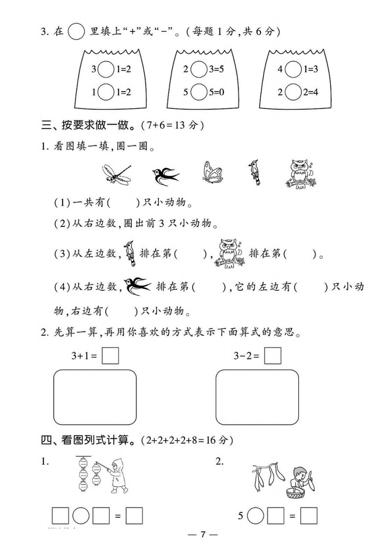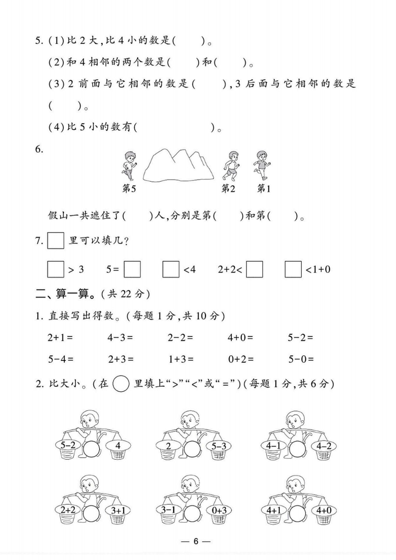 2025人教版一年级上册数学第一单元达标测试卷(4xxb)(1)tangqi883天前发布关注私信1.08MB5页0498 第1页 / 共5页 第2页 / 共5页 第3页 / 共5页 试读已结束,还剩2页,您可下载完整版后进行离线阅读 2025人教版一年级上册数学第一单元达标测试卷(4xxb)(1)此内容为付费资源,请付费后查看¥9.9¥19.9VIP会员免费立即购买您当前未登录!建议登陆后购买,可保存购买订单付费资源© 版权声明本站是一个信息分享及获取的平台,不确保部分用户上传资料的来源及知识产权归属,资料由老师投稿,公开渠道整理,网友上传,如果侵犯到您的权益,请联系客服删除THE END教师资料 文本预览 2025人教版一年级上册数学单元试卷第一单元达标测试卷时间:40分钟满分:100+10分题序三四五附加题总分得分一、填一填。(第4题8分,其余每空1分,共39分)1.看图写数。盏2.按顺序填数。14523.3只盞4.(1)和()同样多。森林运动会(多少)。器5- 查看更多 收起部分 喜欢就支持一下吧点赞8 分享QQ空间微博QQ好友海报分享复制链接收藏