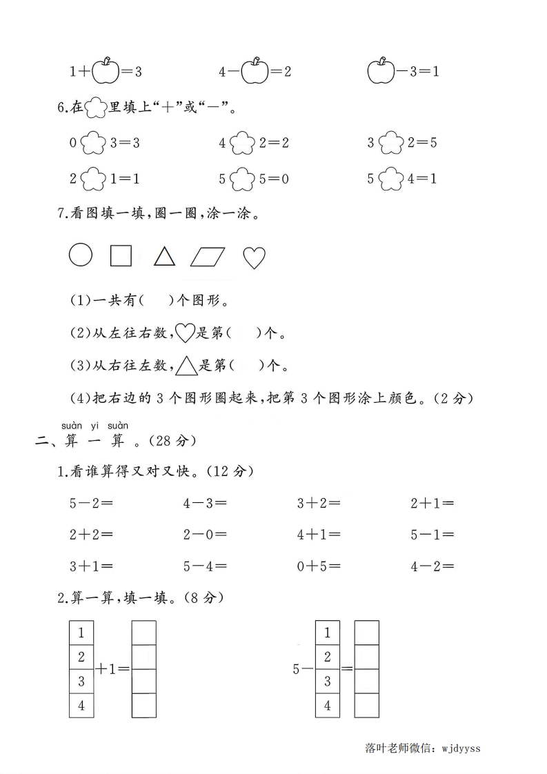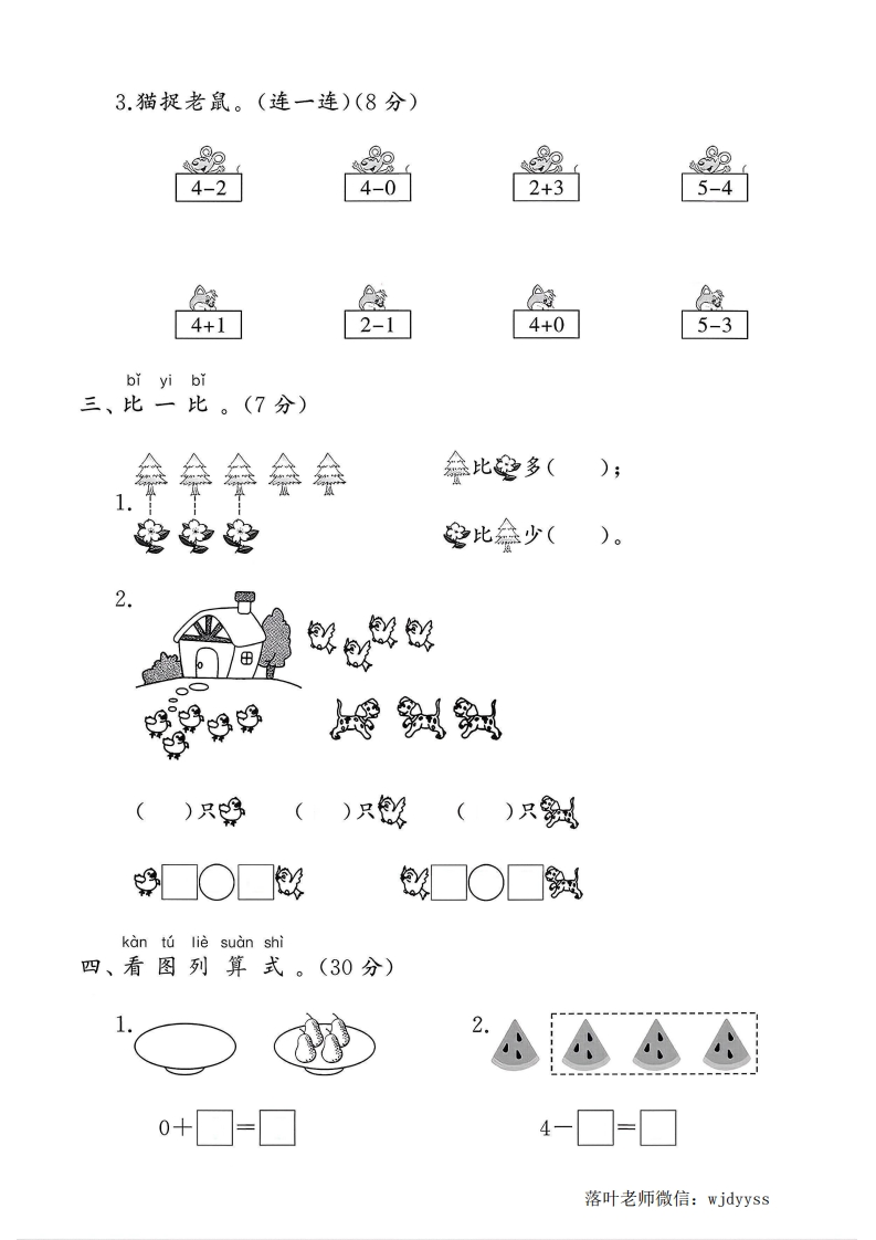 2025人教版一年级数学上册第一单元测试卷(小学教育)tangqi884天前发布关注私信12.84MB8页04015 第1页 / 共8页 第2页 / 共8页 第3页 / 共8页 试读已结束,还剩5页,您可下载完整版后进行离线阅读 2025人教版一年级数学上册第一单元测试卷(小学教育)此内容为付费资源,请付费后查看¥9.9¥19.9VIP会员免费立即购买您当前未登录!建议登陆后购买,可保存购买订单付费资源© 版权声明本站是一个信息分享及获取的平台,不确保部分用户上传资料的来源及知识产权归属,资料由老师投稿,公开渠道整理,网友上传,如果侵犯到您的权益,请联系客服删除THE END教师资料 文本预览 2025人教版一年级数学上册单元测试卷I!::第一单元测试卷时间:60分钟满分:100分+10分题序二三四附加题总分得分!弥tian yi tian一、填一填。(35分)1.看图写数。封第线密:.内!2在里填上合适的数。.不☐>3□K2☐=34>☐3.分一分。要:.答1毁:题4.在(○里填上“>”“<”或“=”3-2(○4-11+3○2+23-1-25-1○1+24-2○3+11+1(○4-2(B-克g5.填一填,使等式成立。3+C5=52+C8=45-C=2落叶老师微信:wjdyyss 查看更多 收起部分 喜欢就支持一下吧点赞15 分享QQ空间微博QQ好友海报分享复制链接收藏