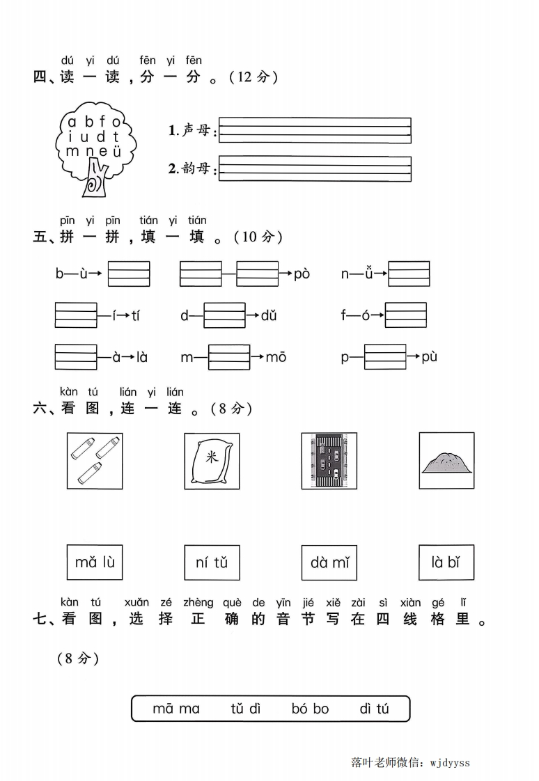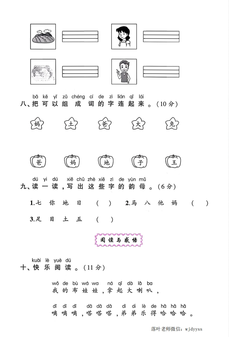 2025人教版一年级语文上册单元测试卷第二单元测试卷:时间:60分钟满分:100分题序二三四五六七八九+十一总分鄂得分书法展示弥汽%%典zai si xian ge li zheng que chao xiěxia lie zi mǔ!一、在四线格里正确抄写下列字母。(8分)希封…ebdp线装。基础巩固kantuXuǎn yi xuantian yi tian量二、看图,选一选,填一填。(8分)e:答1.E只大白())姨,您好!毁3.一条大()鱼。4我()了题lian yilian rang mi feng fei daodui ying de hua duo shang三、连一连,让蜜蜂飞到对应的花朵上。(10分)过MMbamada_tlù爸落叶老师微信:wjdyyss