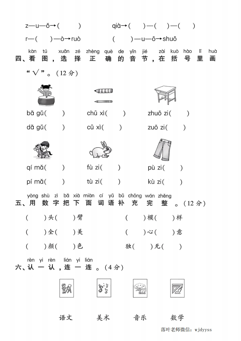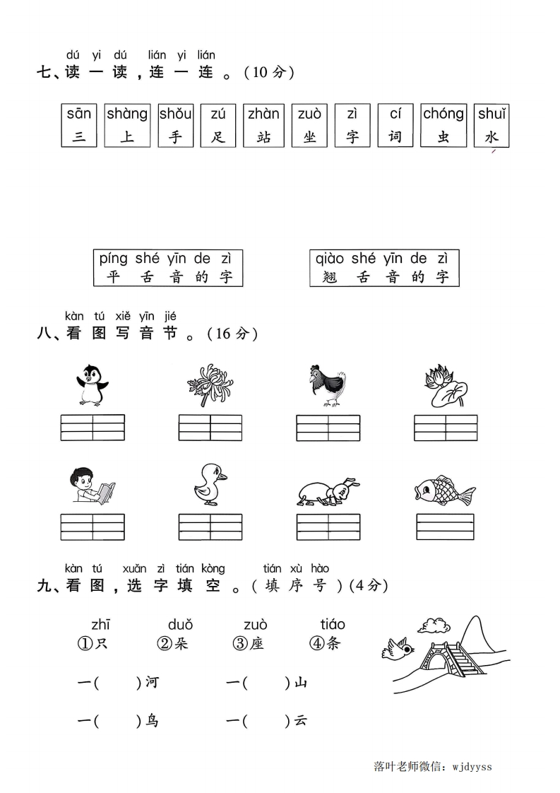 2025人教版一年级语文上册单元测试卷:第三单元测试卷:时间:60分钟满分:100分题序二三1四五六七八九+十一总分得分::书法展示弥"%当习zaisixiàngerzhèng que chao xieěxia liezimǔ一、在四线格里正确抄写下列字母。(4分)封靠gWshZs线:!内!令w多基础巩固7,当为不tu yi tu二、涂一涂。(7分)1.把三拼音节的小鱼涂上颜色。(3分)要kě&Okuà答毁haohu&gù题2.把整体认读音节涂上颜色。(4分)》Gpin yi pin xiěyixiě:三、拼一拼,写一写。(14分):g→()一()k一()一()→kuà:j-ǜ→()()一()一()→cuò落叶老师微信:wjdyyss
