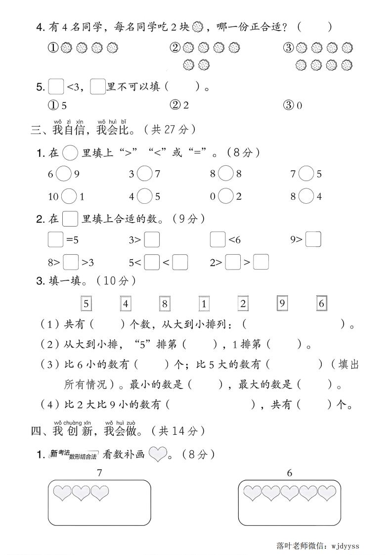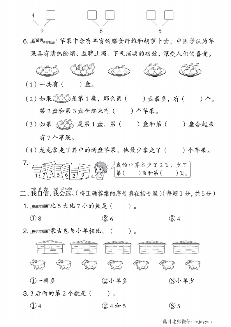 2025西师版一年级数学上册第一单元测试卷时间:60分钟满分:100分我聪明,我会填,wo congmingwo hui tianwo hui tuwo hui quan我会涂,我会圈。(第2题5分,第3题4分,其余每空1分,共35分)1.先数一数,再写一写。站2包朵花小朋友个0个萝卜帕2.动物运动会。第第第3第第第封(1)请补填选手名次。(2)把第2名涂成红色,并圈出2只动物。(3)p前面有()只动物,后面有()只动物。3.找规律,在里填上合适的数。(1)9、8、7、☐■(2)4、☐、6、☐8站(3)☐3、5、7、☐(4)☐、☐、4、2、04.3添上1是();8添上1是();7添上()是9;()添上2是5。5.想一想,填一填。62375落叶老师微信:wjdyyss