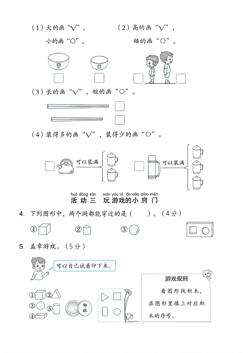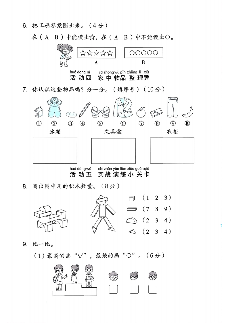 2025西师版一年级数学上册综合与实践测试卷综合与实际测试卷●时间:60分钟满分:100分+10分龙龙是一名一年级的小学生,学习了“我的幼儿园”后,现在他要介绍自己的家,大家快来一起帮他完成吧!huo dong yiju jia shu xing xiao ren wu活动一居家数形小任务1.用“数”说一说,圈一圈。(12分)警倒客厅里有(123)盆绿植,墙上有(567)幅画,沙发上有(234)个抱枕,桌子上有(123)本书。2.用“形”说一说,连一连。(9分)平平的、长长的紫方方正正的圆圆的,可以滚动huo dong erjia zhong bi jiao da bi pin活动二家中比较大比拼3.按要求比一比,画一画。(每题6分,共24分)》