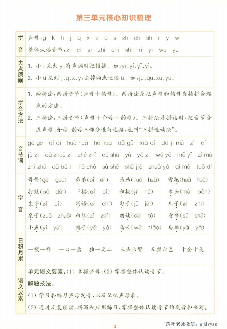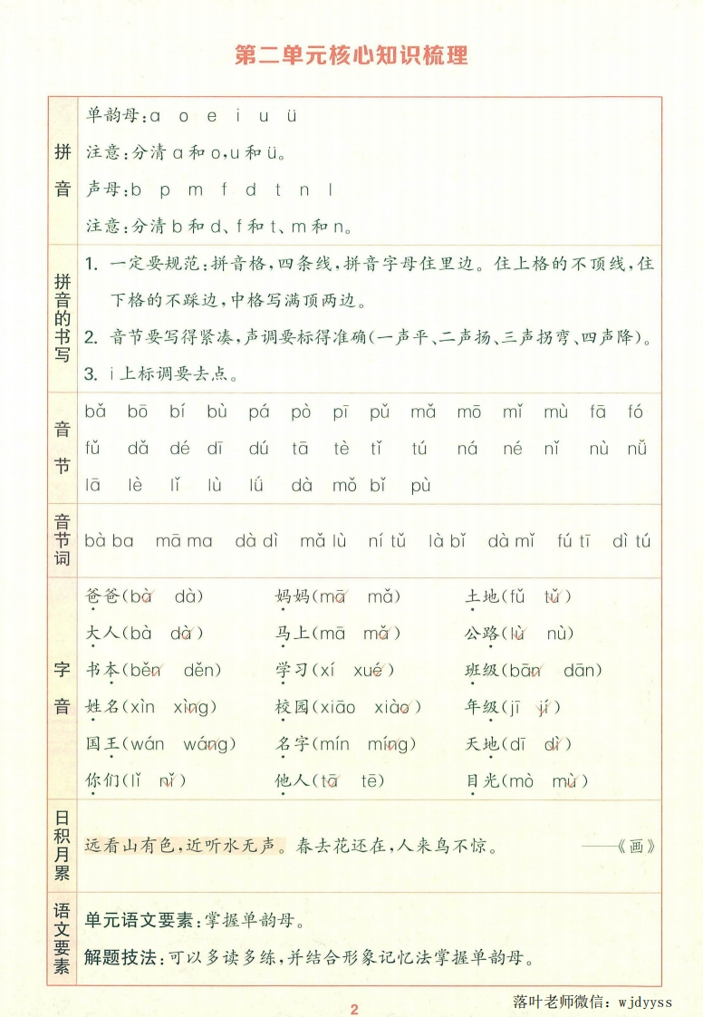 第一单元核心知识梳理人们(renreng)你好(吖Ri)三只(shansan)字上下(shàngsang)手足(shasǒu)坐下(cuòZuò)音水火(suishui)山川(sanshan)六月(idni心)耳:最后一横长,稍向右上斜。目:里面是两横,不能写成一横。字手:第四笔弯钩不能写成竖钩。火:写时要注意点、撇的方向。形禾:上面的撇不能写成横。七:第一笔为横。口:17口耳:一下可可可耳目:1刀月月目笔手:三手日:1门月日火:·少火顺田:1门曰用田禾:”二千千禾六:、之六六日(日子)田(水田)上(上去)一下(下来)》形人(大人)一天(白天)耳(耳朵)一目(目光)》口(开口)田(田地)日(生日)一目(节目)反上一下分一合今一古天一地日鹅,鹅,鹅,曲项向天歌。白毛浮绿水,红掌拨清波。累[唐]骆宾王《咏鹅》单元语文要素:了解多种识字方法。解题技法:语(1)借助图画识字。例如:《日月山川》一文中,可以通过图画来识记所学聚象形文字。(2)借助生活经验识字。例如:《口耳目手足》一文中,可以通过观察周围事物来识字。如通过观察“口腔医院”来加深对“口”的理解。落叶老师微信:wjdyyss